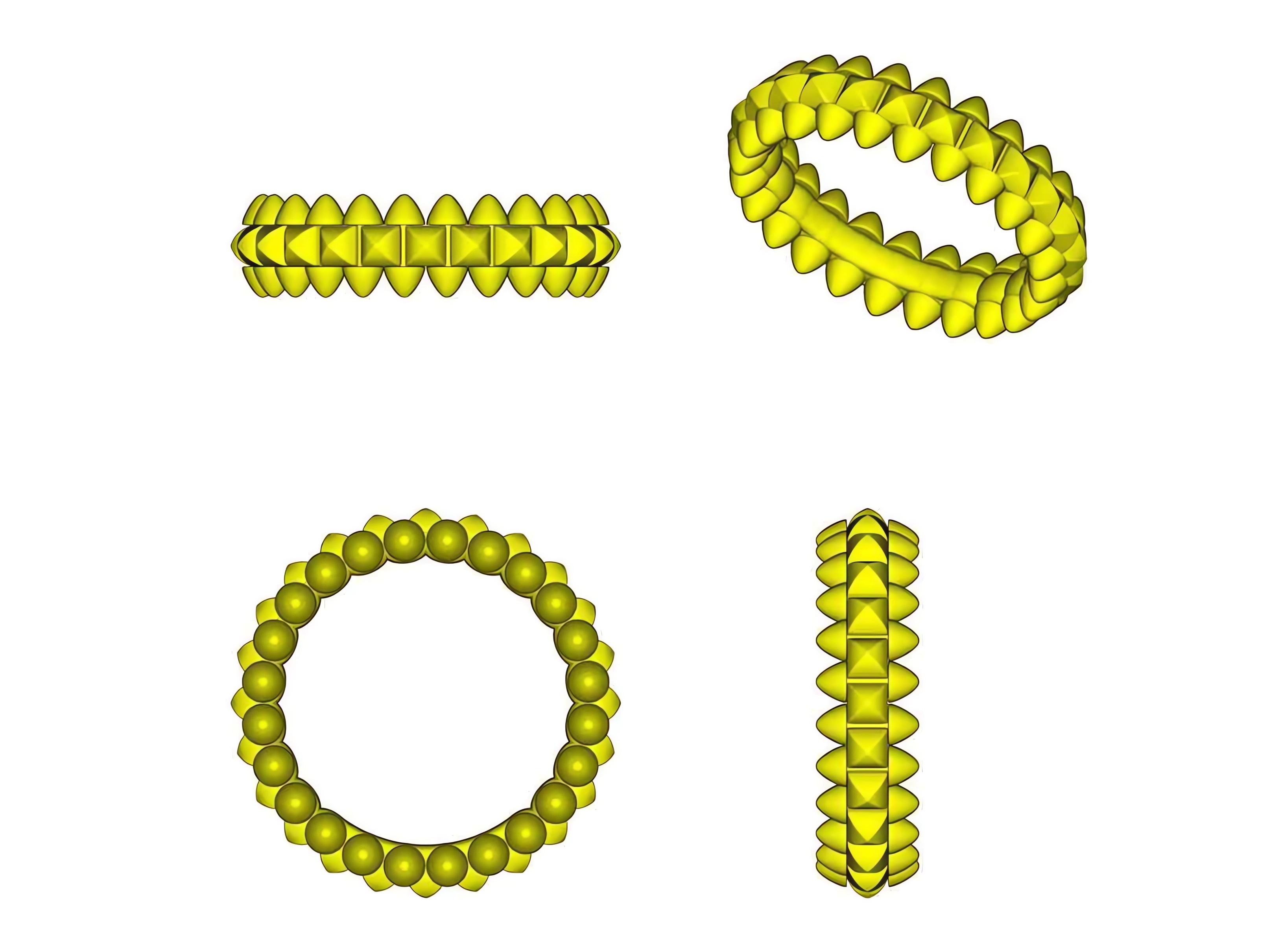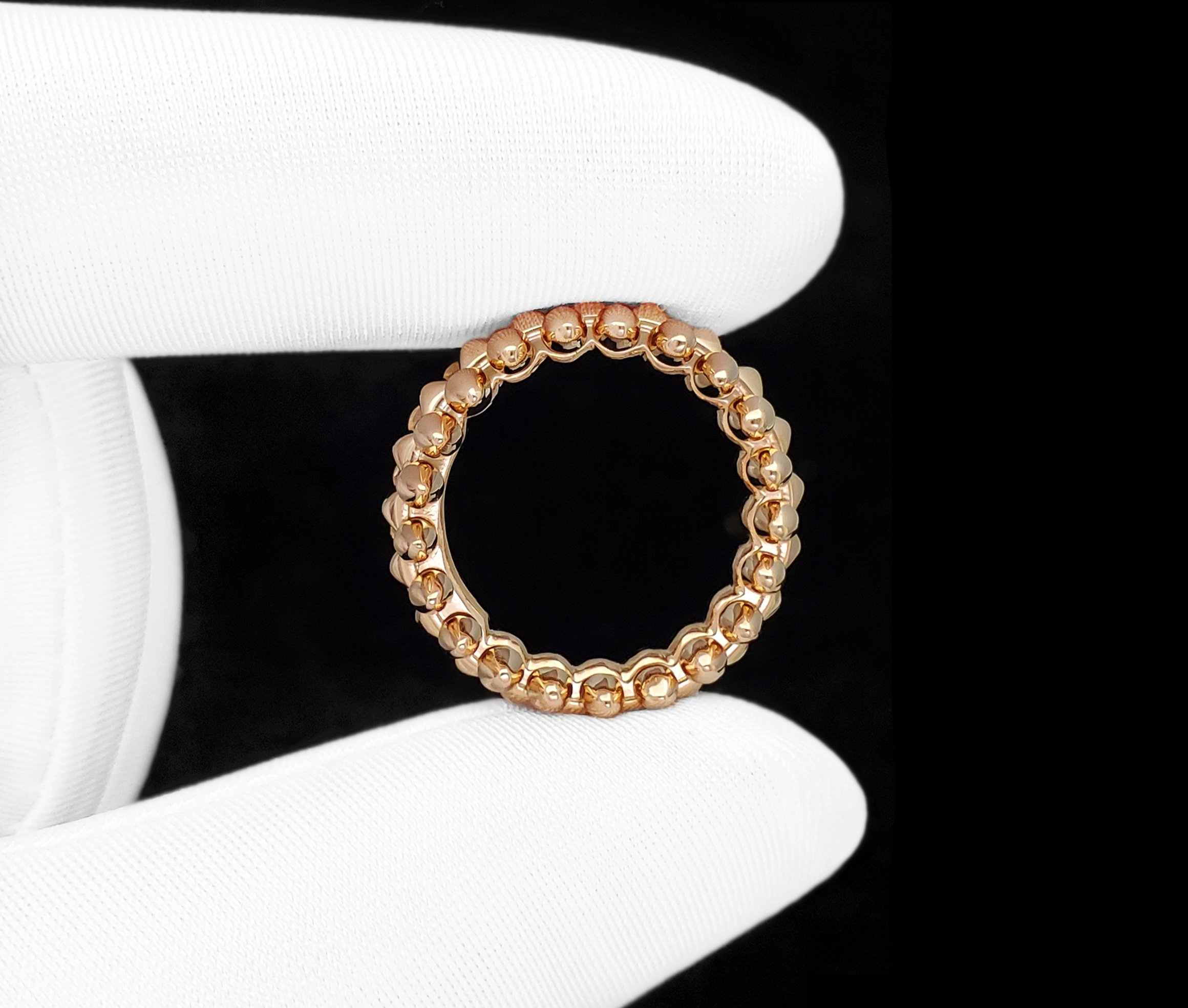 设计层面,两侧铆钉呈现饱满的圆锥造型,表面采用镜面打磨,光可鉴人,其底部连接了一跟金属杆,同时与相对的铆钉形成一体,以此固定在戒圈的缝隙中,形成上下呼应的整体结构。以52号指环为例,共搭配了22组子弹头造型的铆钉,不过其数量会随着圈口尺寸的变化而调整,从而确保设计比例的协调性。
