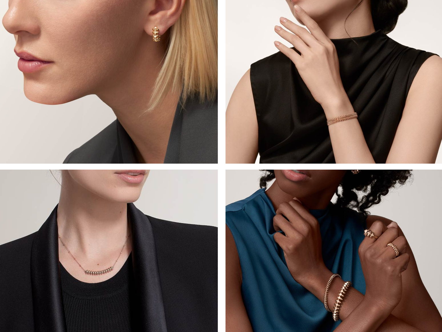 卡地亚的Clash de Cartier系列可谓其突破传统美学框架的革新之作。该系列诞生于2019年4月,设计师巧妙融合了“尖头铆钉”、“彩宝圆珠”和“方形饰钉”三大经典元素,并通过天马行空的排列组合,打造出兼具前卫风格与精湛技艺的珠宝臻品,完美诠释了都市女性独立自信的现代气质。