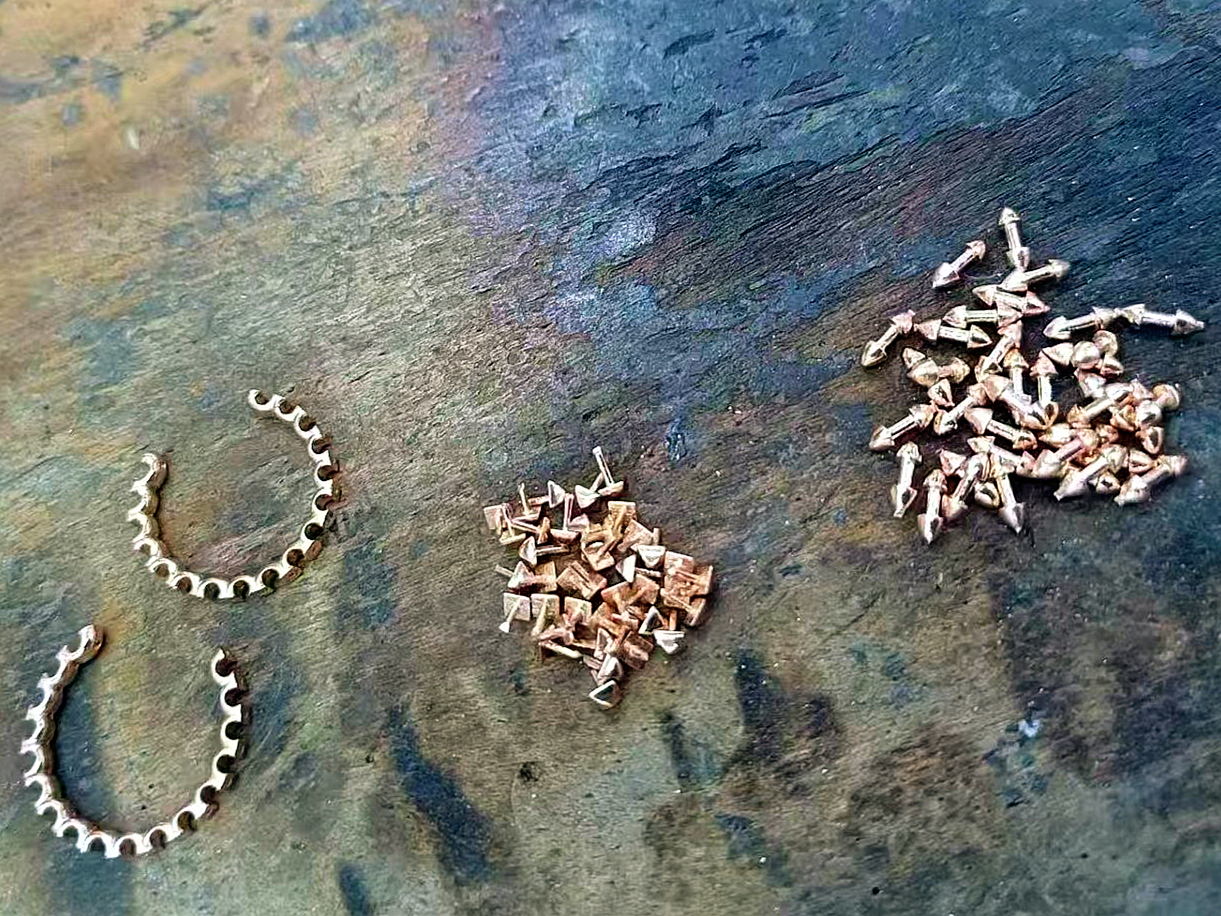 虽然这款戒指看起来是个整体,但实际上采用了精妙的模块化设计构造。在制作过程中,工匠们需要分别铸造中心的戒圈和两侧的箭头,然后再经过依次的组装、焊接、定位、调试等。每个铆钉位置都保留了微小的活动空间,虽然赋予戒指一丝灵动的韵味,但也给接下来的工序带来不小挑战,尤其在抛光环节,只能借助微型工具对每个铆钉细细打磨,因此这枚戒指的制作周期相对较长,工时成本也相对较高。