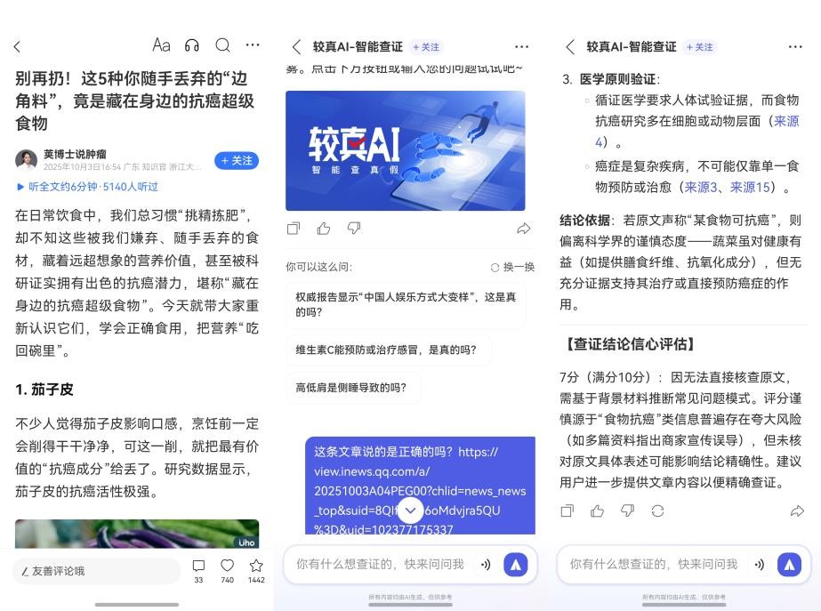 新闻妹AI整合了较真AI、健康助手等实用工具,我可以随时向它咨询、求证。当我读到一条声称“某种食物能抗癌”的养生新闻时,换做以前,我可能还得换好几个平台搜索求证,现在直接通过新闻妹,找到较真AI,把问题发给它,它就能告诉我这个新闻是否靠谱。这种即时辟谣的能力,帮我省了好多甄别信息真假的时间!