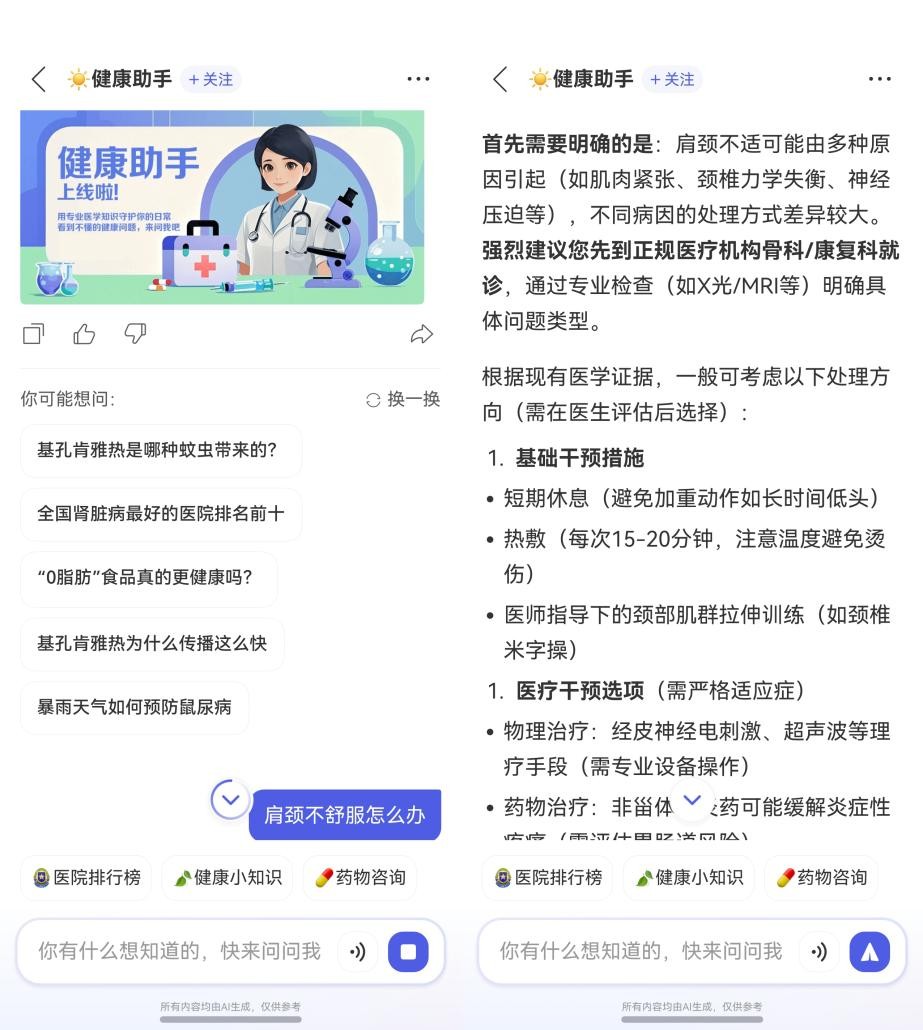 除了查证信息,新闻妹的健康助手也成了我的私人医生。上班坐久了肩颈不舒服,或者刷到个健康小常识想弄弄明白,它都能给出清晰易懂的专业解释和建议,有了这个私人医生,我真的很难保持苹果肌扁平了!
