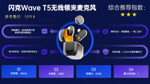 闪克Wave T5主打的优势是“智能降噪+长续航”,作为性价比品牌中的进阶款,在核心性能上比入门款有明显提升,价格却控制在800元左右,竞争力十足。提供一拖一和一拖二两个版本,其中一拖二版本支持双麦独立调节参数,适合双人对话、采访等场景,适配性广泛。