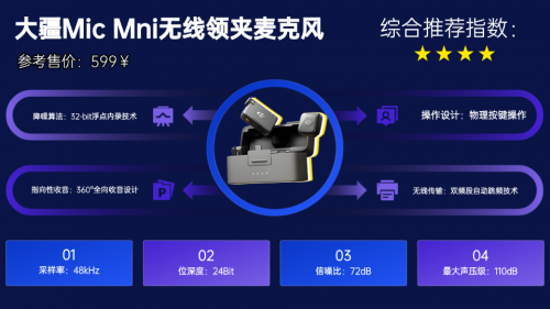 大疆DJI Mic Mini主打的优势是“极致轻量化+生态联动”,定位入门级市场,却保留了大疆的核心技术。提供一拖一和一拖二两个版本,价格亲民,在500元左右,是大疆生态用户入门的绝佳选择。