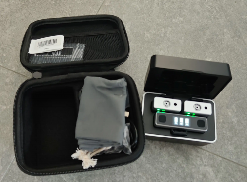 机身采用金属材质,质感扎实但重量控制尚可,单发射器12克的重量佩戴起来不会有明显坠感,不过长时间接触皮肤会有些微凉。操作逻辑清晰,显示屏数据直观,能实时看到电量、信号和收音模式,但金属机身在潮湿环境下需要注意防滑,户外拍摄时最好搭配挂绳避免意外掉落。另外它的配件丰富,防风毛套、海绵套、不同规格转接头一应俱全,开箱就能适配多种设备。