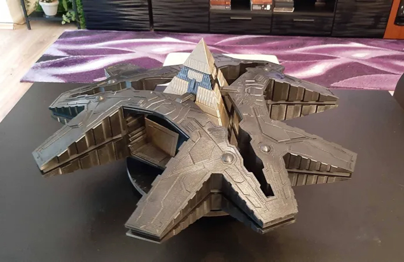 概念设计确定整体风格方向,可参考科幻影视作品中的异星建筑特征,如不规则几何体组合、流线型/块面化造型、能量核心装置等。建议绘制多视角草图标注大致尺寸比例。
