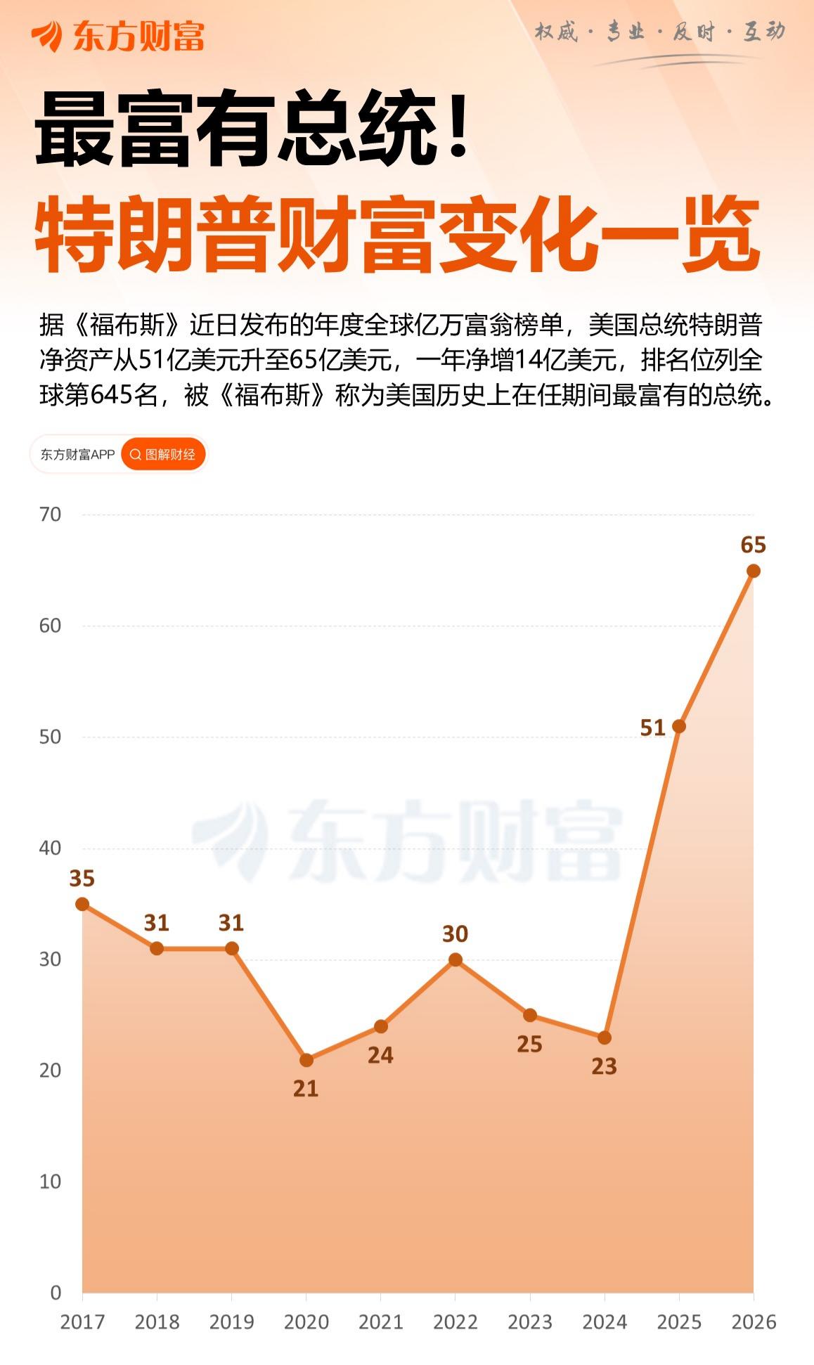 近日,全球知名财富媒体《福布斯》公布2026年度全球超高净值人群榜单,现任美国总统特朗普个人资产规模由51亿美元攀升至65亿美元,年度增幅达14亿美元,折合人民币约96亿元,全球排名上升55个位次,位列第645位,该媒体同时认定其为美国历任在任总统中身家最高者。