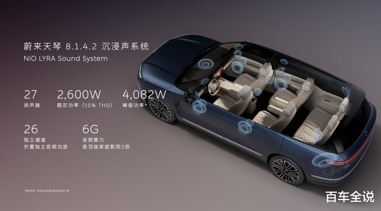 全新ES8引领全感官极致座舱视听体验。蔚来天琴8.1.4.2沉浸声系统拥有27个扬声器、 2,600W额定功率和4,082W 的峰值功率,支持杜比全景声,远超行业顶级音响水准。搭载全球首发的Dirac RRM「超境临场」技术,声场还原能力行业第一。