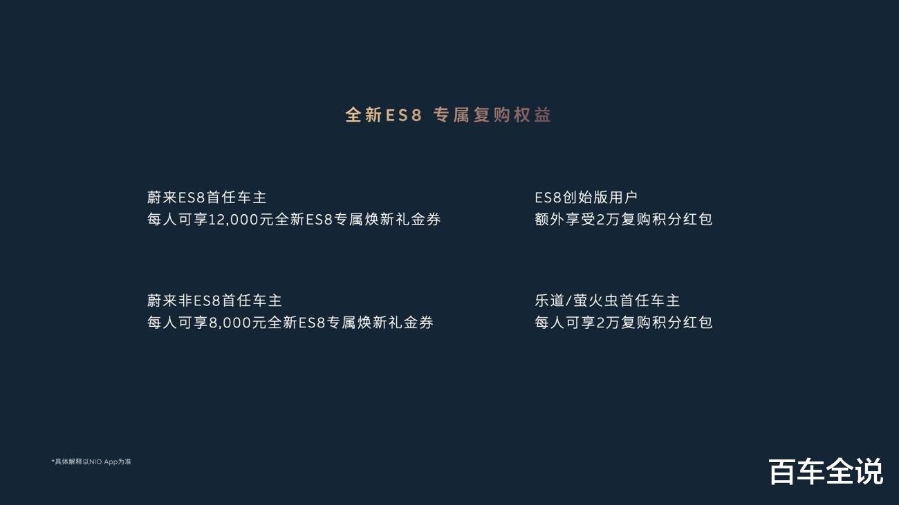 蔚来也为老用户提供了全新ES8的专属复购礼遇:蔚来ES8首任车主可享12,000元专属焕新礼金券,ES8创始版用户额外享受2万复购积分红包,蔚来非ES8首任车主可享 8,000 元专属焕新礼金券;乐道/萤火虫首任车主每人可享2万复购积分红包。