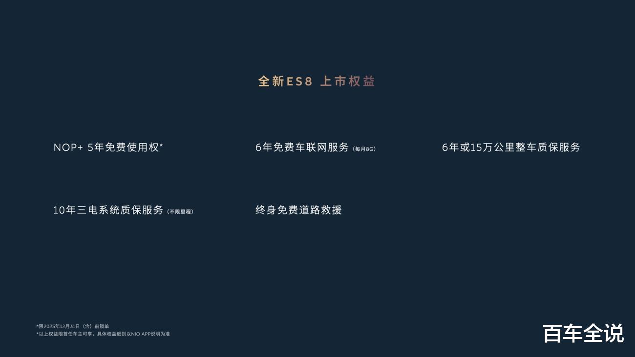 2025年12月31日(含)前下定蔚来全新ES8的用户,将享受以下权益: 5年免费全域领航辅助NOP+使用权,以及价值2,980元的飞航头等舱五件套,包含舒适软枕套装、第三排侧窗遮阳帘、全车簇绒脚垫、前备舱防护储物垫以及智能香氛瓶套装。全新ES8首任车主还可享受6年免费车联网服务、6年或15万公里整车质保服务、10年不限里程三电质保服务和终身免费道路救援。