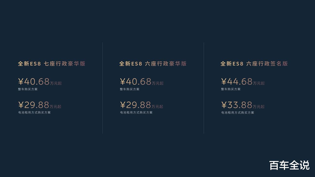 (9月20日,杭州)2025蔚来日(NIO Day 2025)9月20日在杭州举行,蔚来宣布全场景科技旗舰SUV —— 全新ES8正式上市。六座行政豪华版售价 406,800元起,采用BaaS电池租用方式购买,售价298,800元起;六座行政签名版售价446,800元起,采用BaaS电池租用方式购买,售价338,800元起。七座行政豪华版售价406,800元起,采用BaaS电池租用方式购买,售价298,800 元起。七座车型可选专属签名套装,价格为36,000元,包含智能高清投影大灯、智能调光隐私车窗、高性能四活塞气辉橙卡钳、22英寸锻造星耀轮圈、NOMI Mate 3.0以及专属尾标。全新ES8将于9月21日起正式开启交付。