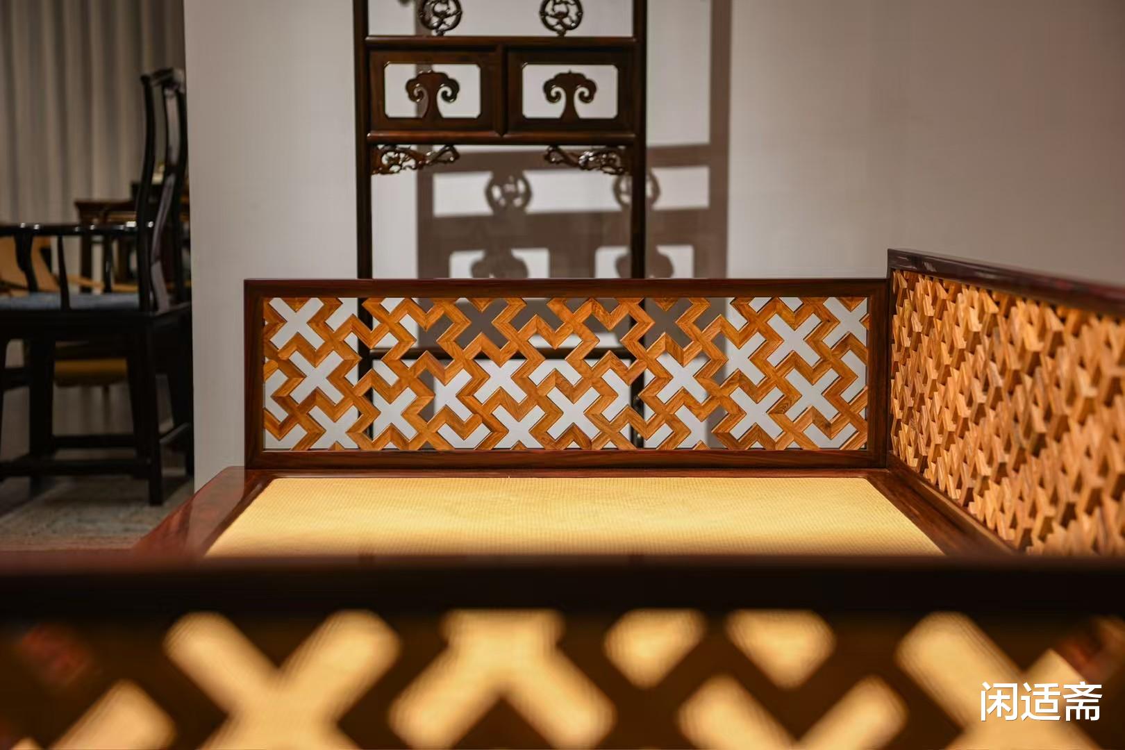 整床以印度小叶紫檀为主体框架,质地致密、木色深紫温润,尽显“木中之王”的稀缺珍贵;围板部位嵌饰海南黄花梨,纹理行云流水,与紫檀一紫一黄、一沉一润,碰撞出独特美感,每一寸木料均精挑细选,彰显选材匠心。
