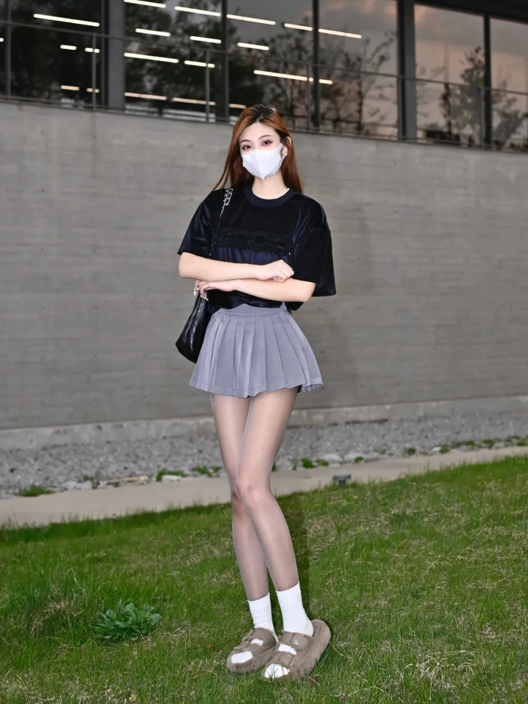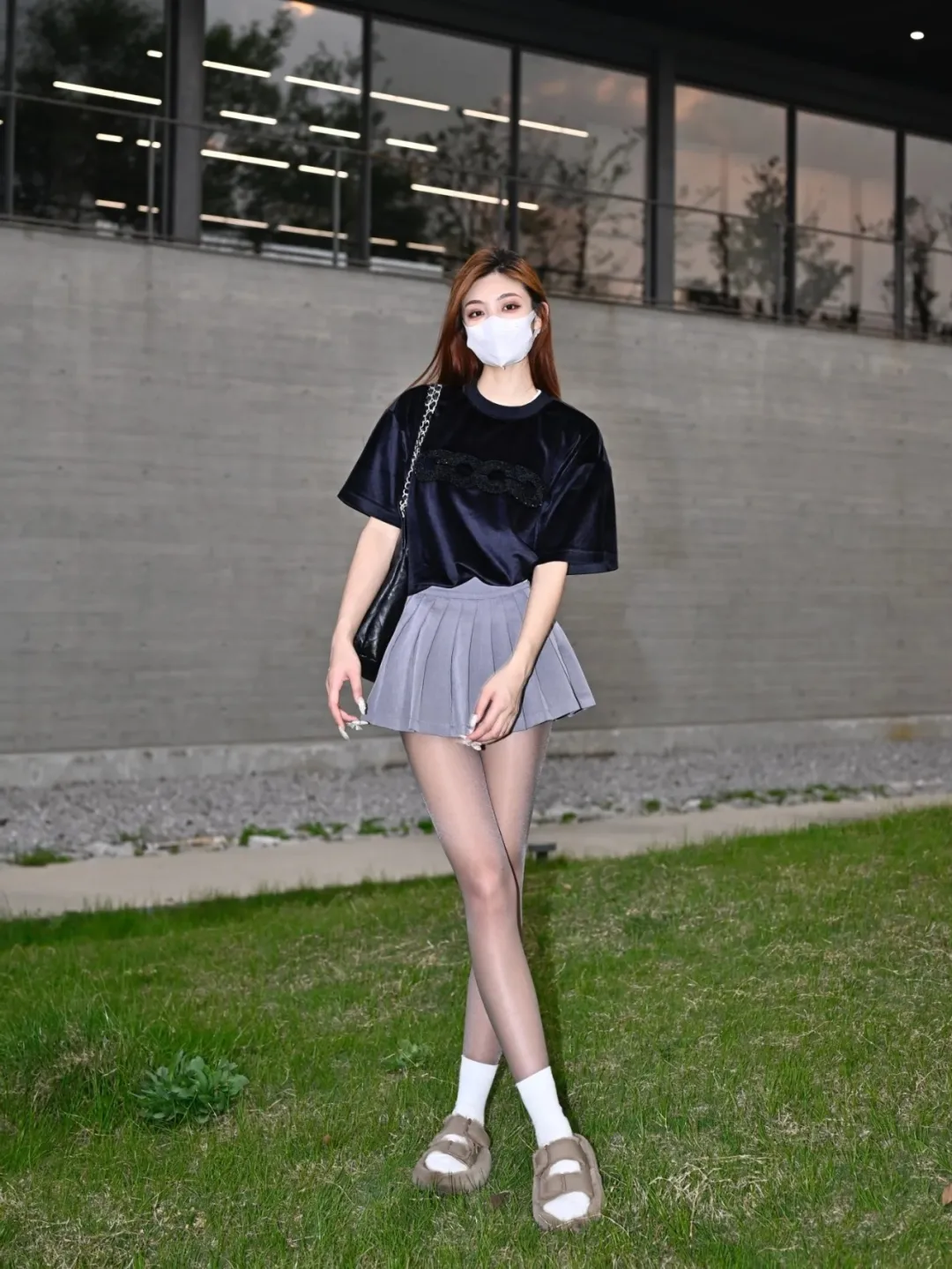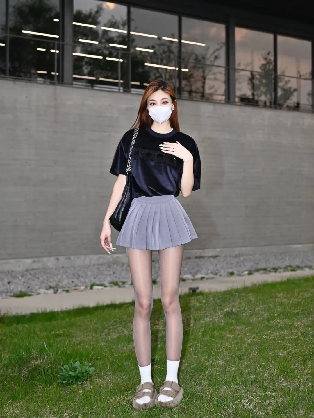 它不挑人,却能衬出人骨子里的美。个子娇小的姑娘穿,百褶裙的长度刚到膝盖,丝袜的亮能悄悄拉长腿部线条,走起来像蹦跳的小鹿,灵动又可爱;个子高挑的姑娘穿,裙摆垂到小腿肚,褶皱的起伏更显优雅,丝袜的亮在阳光下透着冷调的光,像走在巴黎街头的女子,从容又迷人。哪怕是皮肤偏暗的姑娘,浅灰色的裙身能提亮肤色,油亮丝袜的光泽又能让皮肤显得更细腻,不是刻意的修饰,是像给整个人镀了一层薄光,让原本的美更显通透。