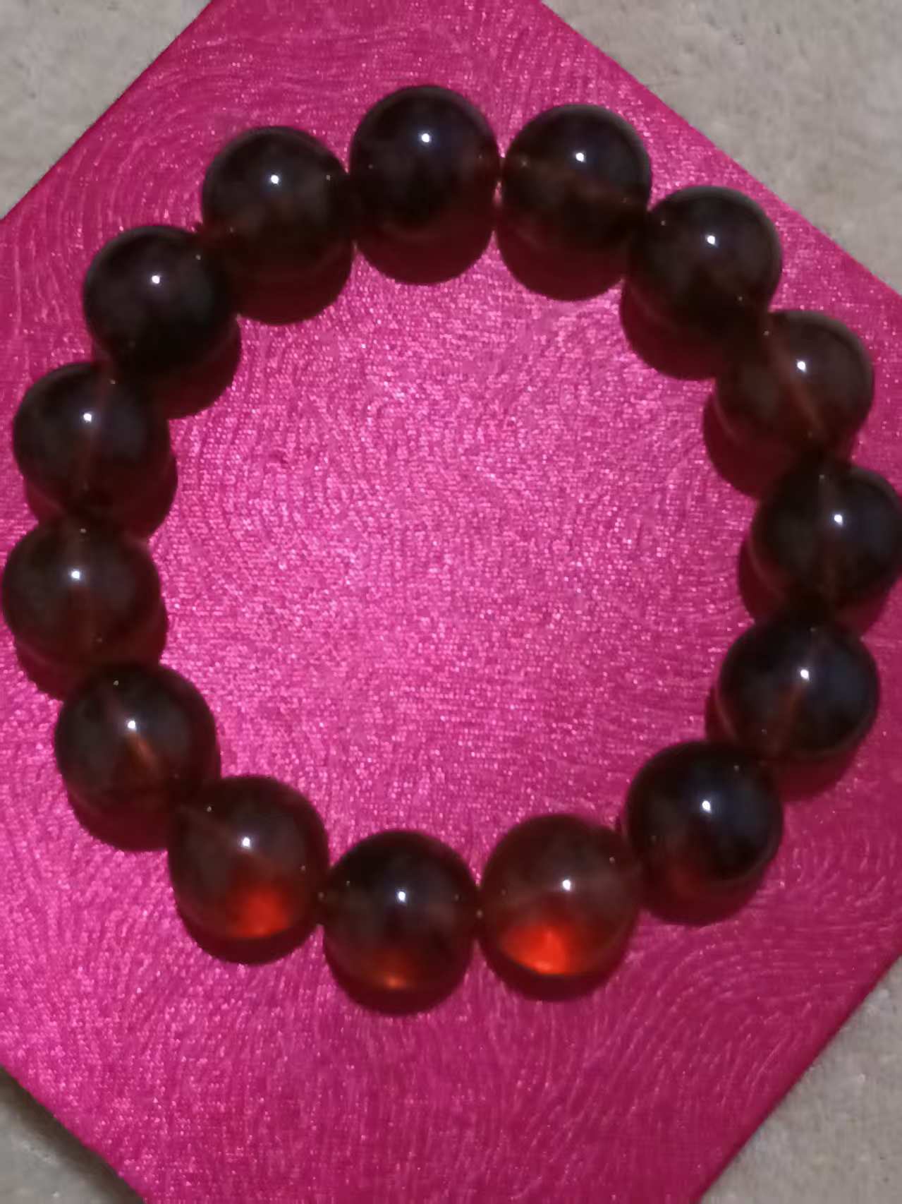 这款手串由多颗灵草珀圆珠串制而成,每颗珠子都经过精细打磨、高光抛光工艺:珠子圆润饱满,表面光滑如镜,最大程度呈现灵草珀的通透质感与 “九金离光” 的色泽层次;颗颗大小均匀、排列规整,佩戴时贴合腕间,既显工艺师对细节的严苛把控,又让腕间美学与佩戴舒适度达成平衡。