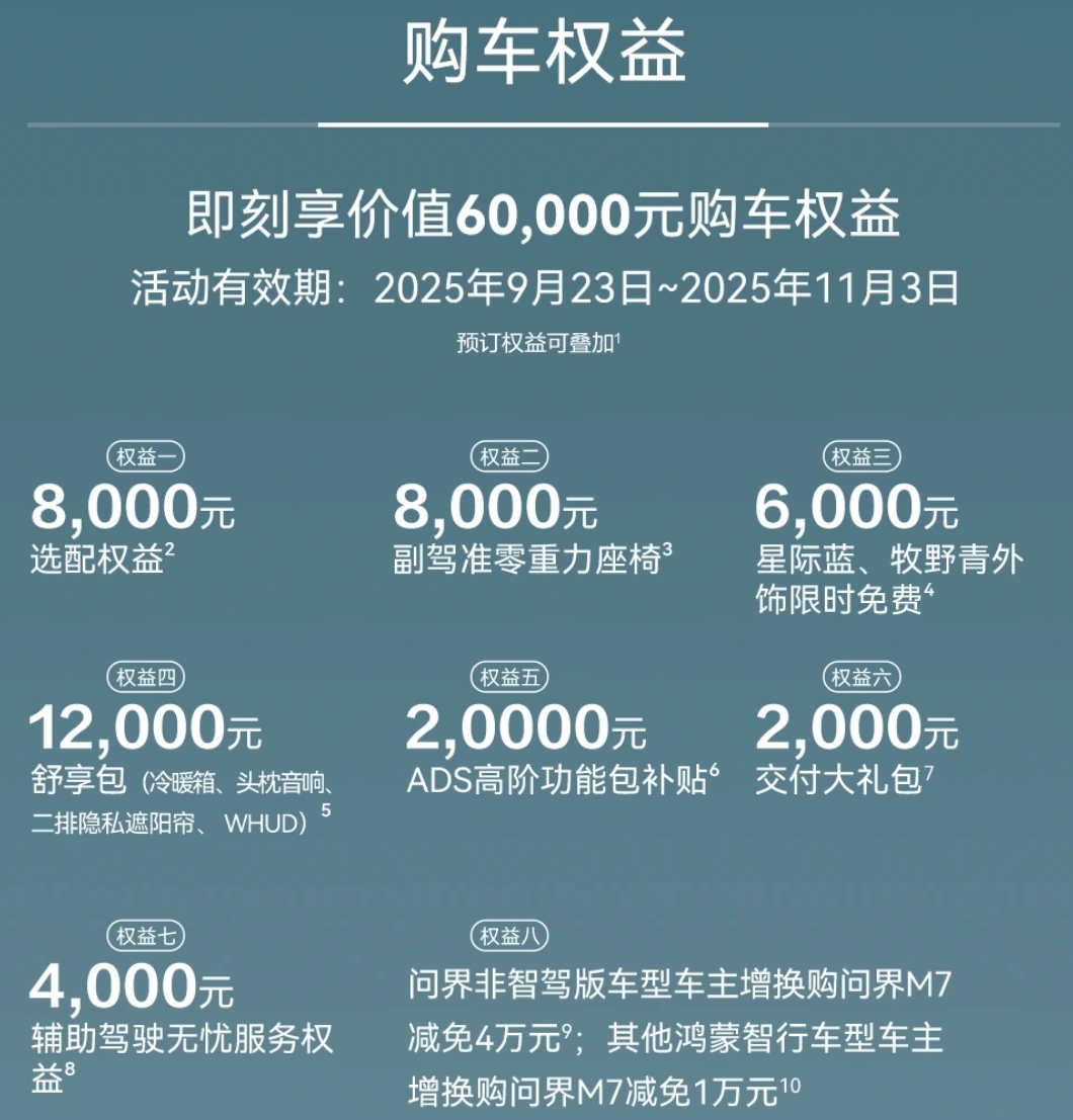 问界M7共有7项车主权益,其中,12000元的舒享包包括冷暖箱、头枕音响、二排隐私遮阳帘、WHUD。