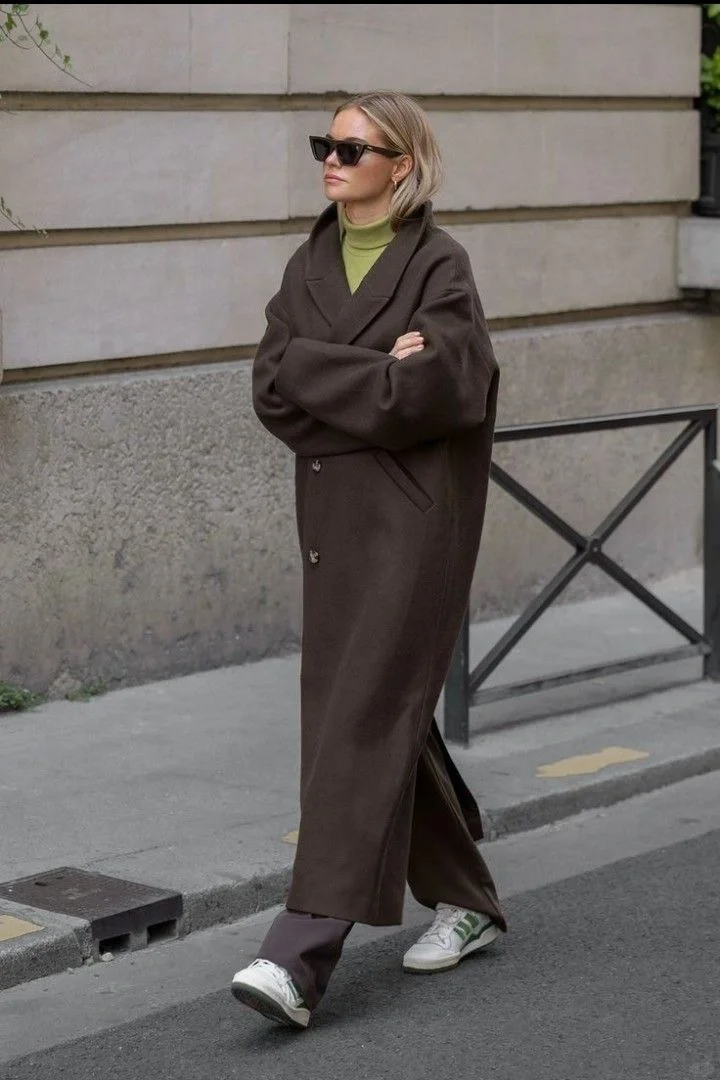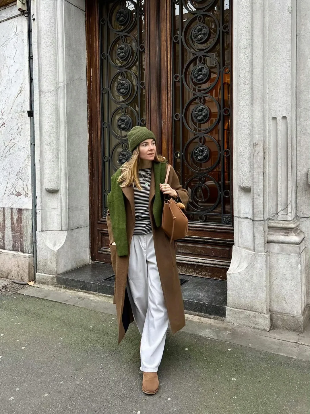 给棕色大衣搭配绿色系单品,棕是大地的醇厚,绿是冬日里未眠的生机,恰是给这份沉寂注入了一抹灵动。把绿色毛衣穿在棕色大衣里,是最直接的撞色浪漫。一条绿色围巾或披肩,一顶绿色帽子,是棕色大衣的 “点睛之笔”,让搭配鲜活起来。