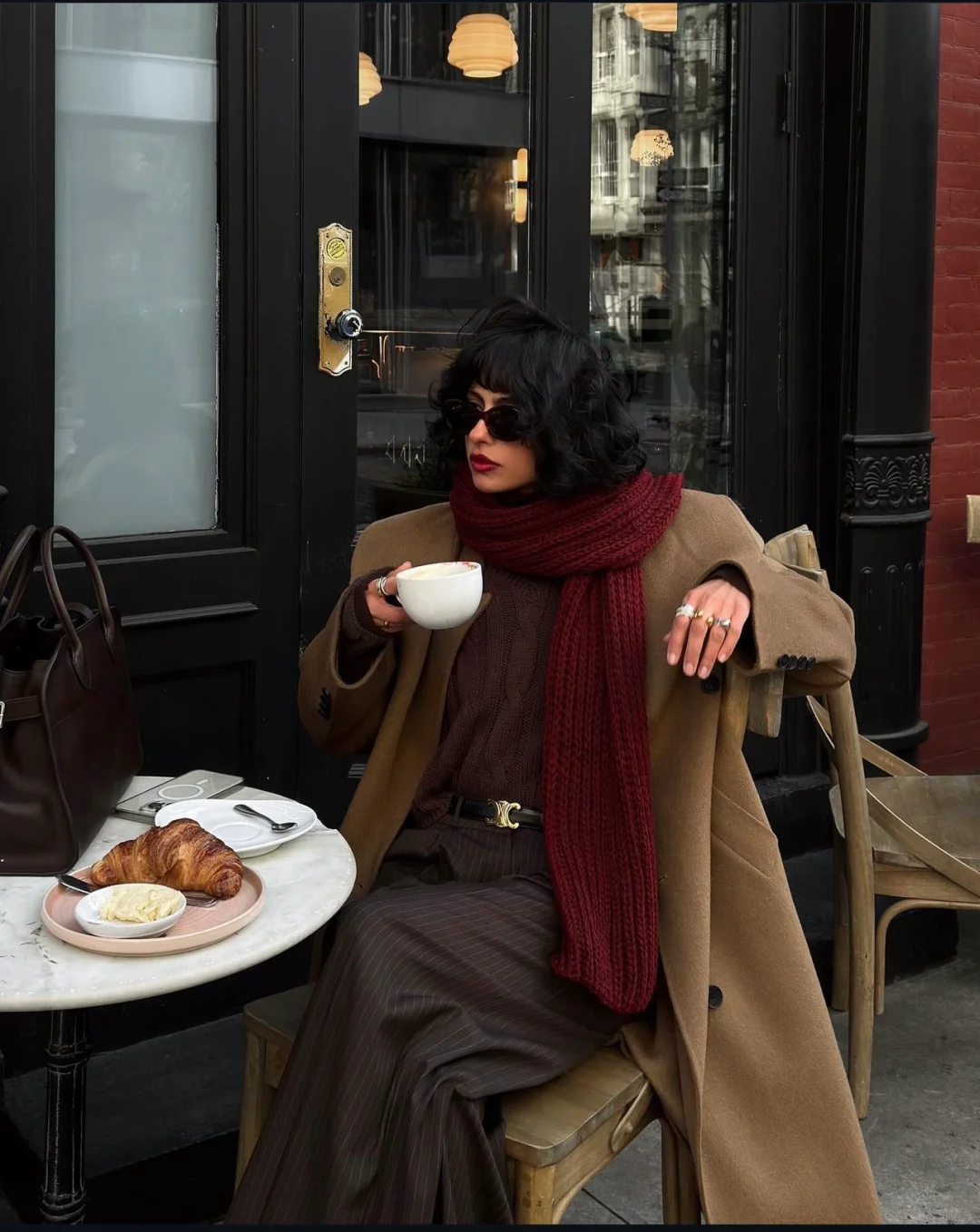 棕色大衣+红色针织衫,红色打破了大衣的单调,让暖调里多了几分风情,配饰也同样重要,一条金色细项链、一副耳钉、一只棕色或红色小包,便足以让整体造型更显精致。