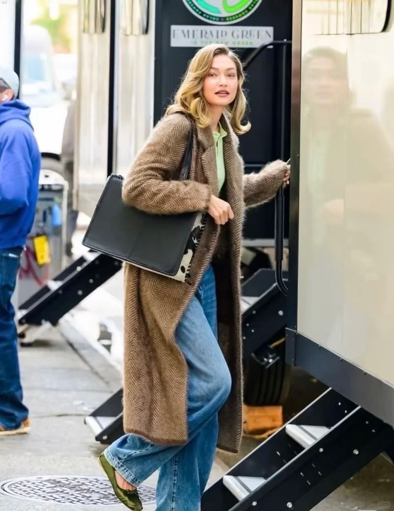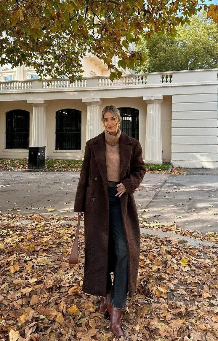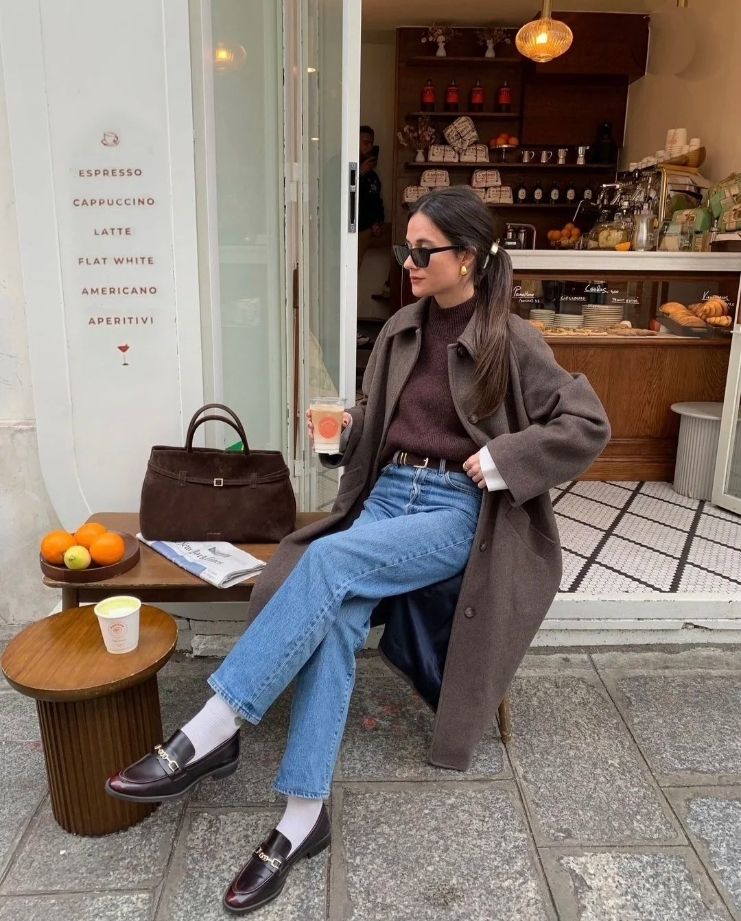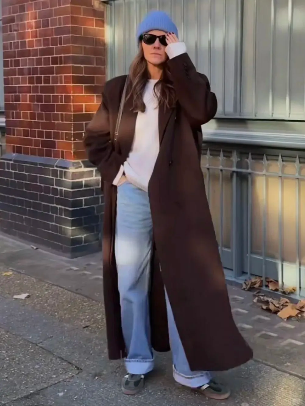 棕大衣配蓝牛仔裤,既有质感又不失随性,把 “低调的时髦” 藏进冷暖交织里。水洗蓝的牛仔布带着磨白的肌理,利落的直筒版型修饰腿型,与大衣的软糯形成材质上的反差;若是浅蓝款,暖而不腻,冷而不冽,平衡得恰到好处。