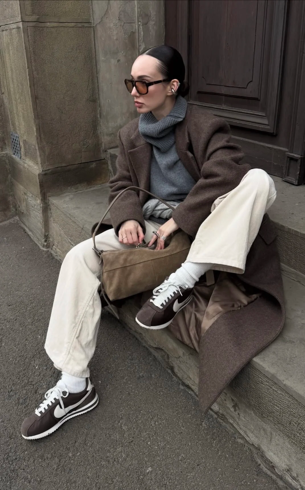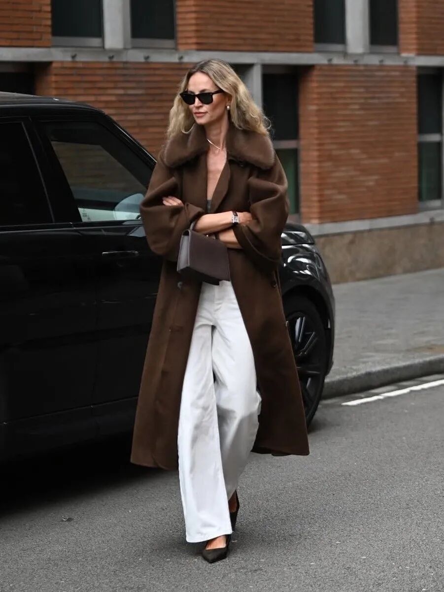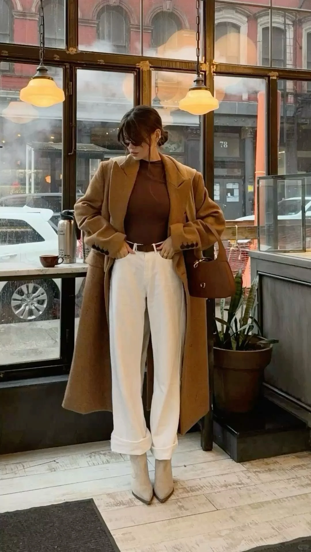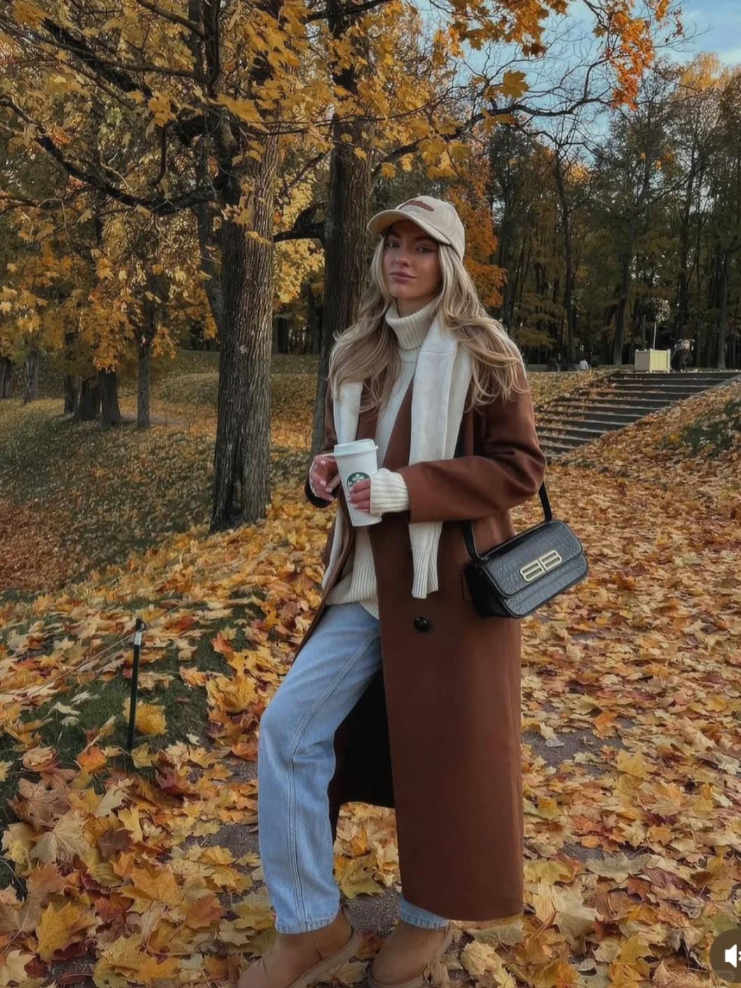 棕大衣配蓝牛仔裤,既有质感又不失随性,把 “低调的时髦” 藏进冷暖交织里。水洗蓝的牛仔布带着磨白的肌理,利落的直筒版型修饰腿型,与大衣的软糯形成材质上的反差;若是浅蓝款,暖而不腻,冷而不冽,平衡得恰到好处。