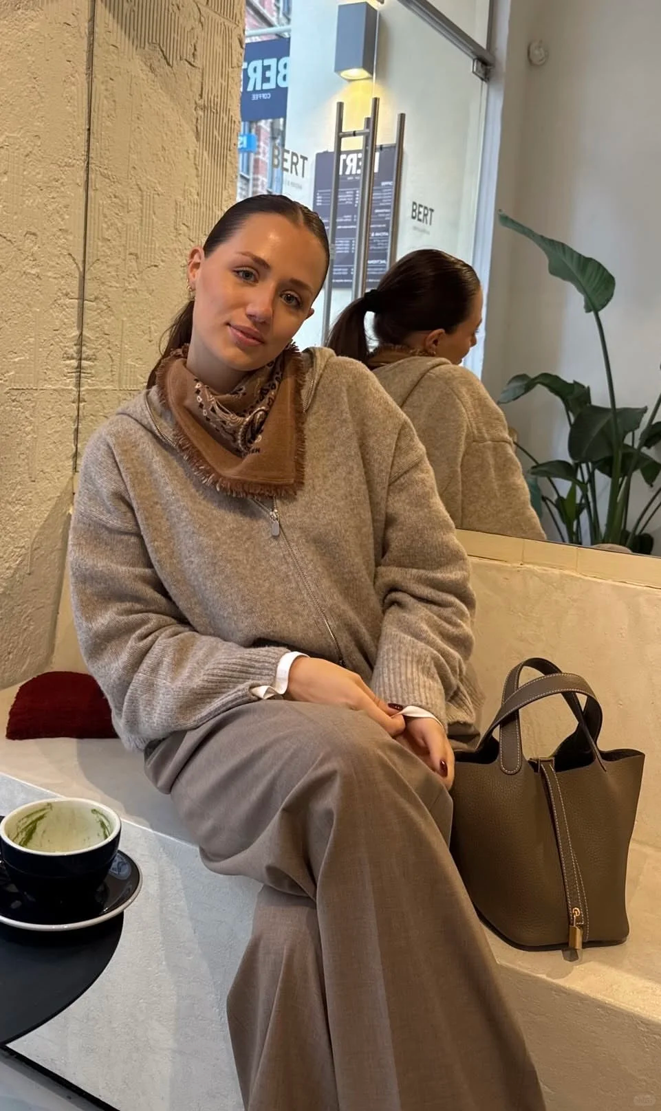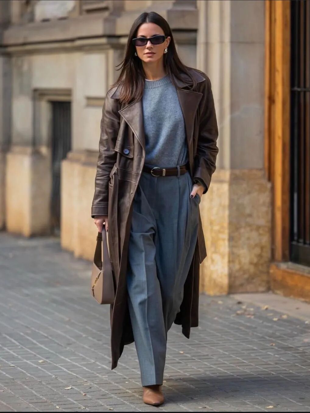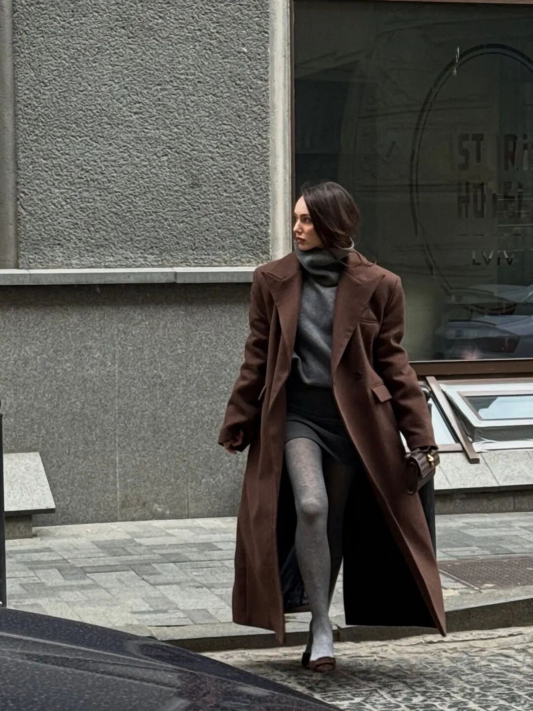 棕色大衣的好,最是那抹 “可触摸的温暖”。而灰色,恰好是这份筋骨的最佳呼应。选择灰色羊绒衫作为内搭,柔化了冬日的冷硬。棕与灰的碰撞,是暖与雅的契合,棕色的暖驱散了灰色的清冷,灰色的雅中和了棕色的厚重,两者相得益彰,把 “低调的时髦” 藏进每一处细节里。