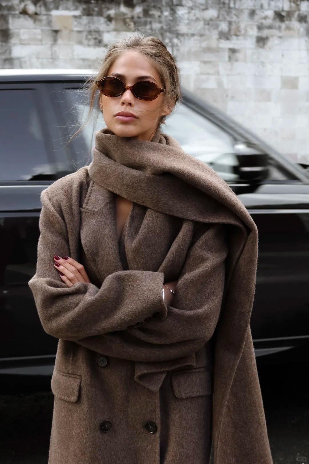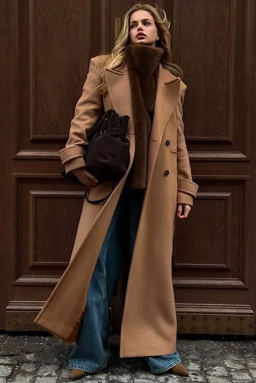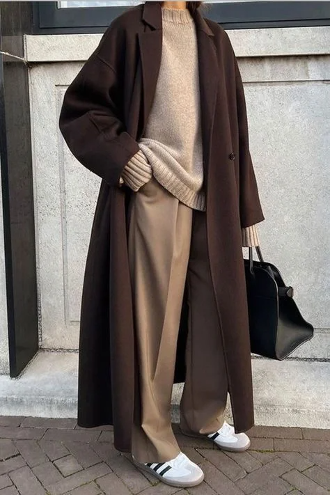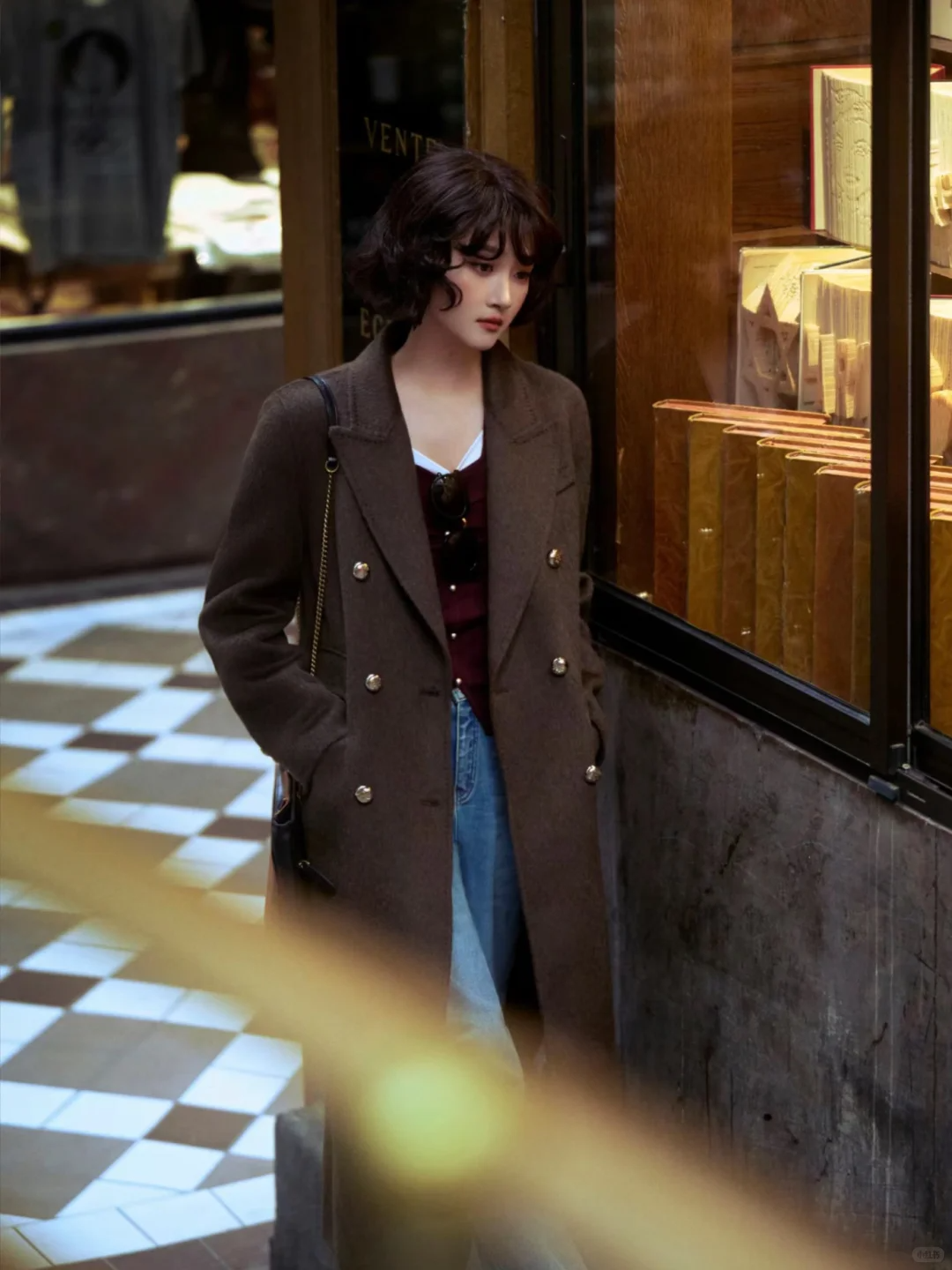 羊毛的软糯肌理与这抹颜色相撞,更是将温暖放大了无数倍:指尖抚过衣料,是羊绒混纺的细腻,目光落在衣摆,是栗子壳般的醇厚,连冷风掠过,都仿佛被这颜色滤去了几分凛冽。