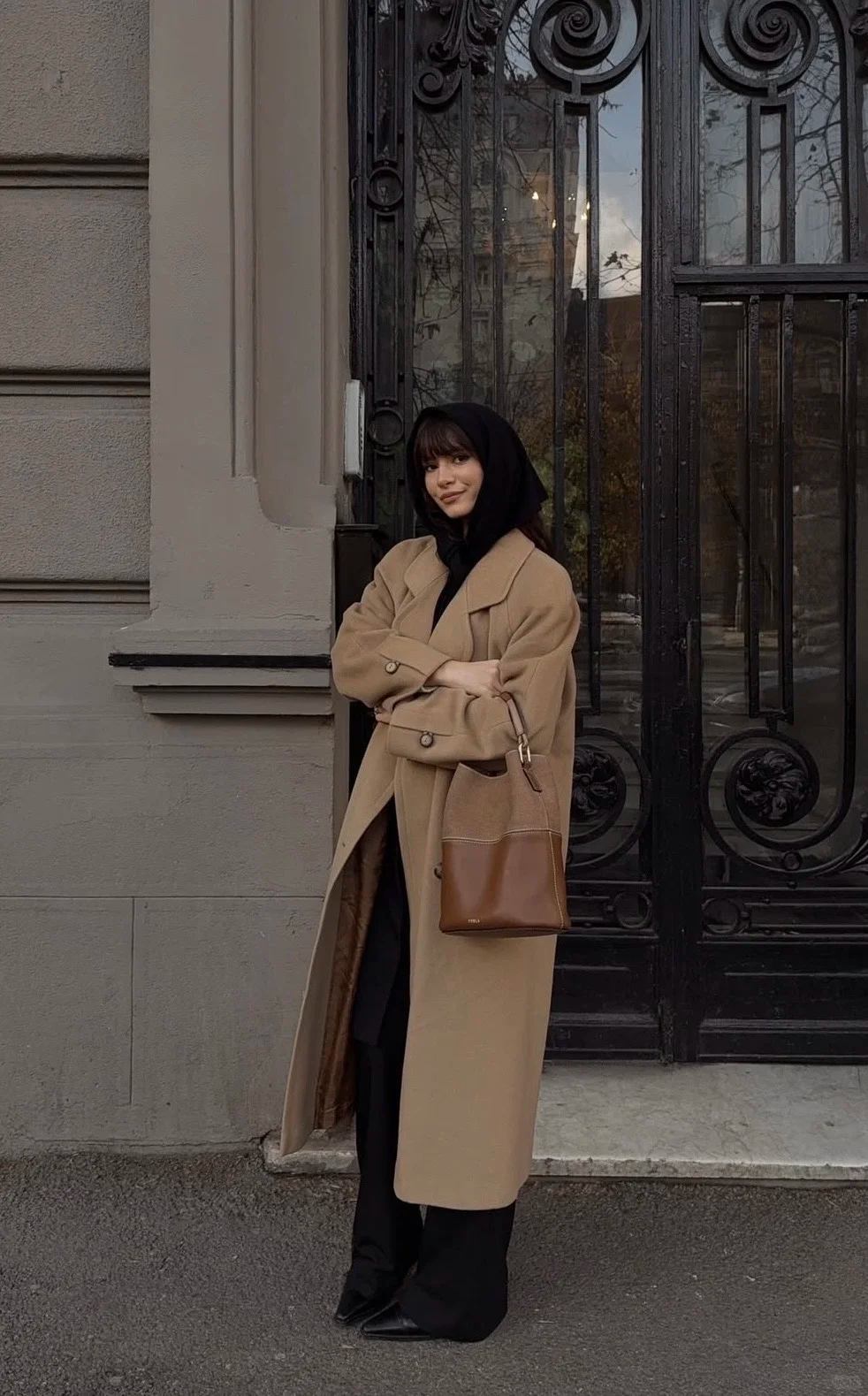 将棕色大衣的内搭换成一身黑色,黑色内搭的利落,恰好中和了棕色大衣的厚重感,让暖而不腻,冷而不冽,两者交织成冬日里最经典的穿搭语言,百看不厌。可以像博主这样配一条黑色三角围巾,与大衣的垂坠感呼应,整体造型流畅又大气。
