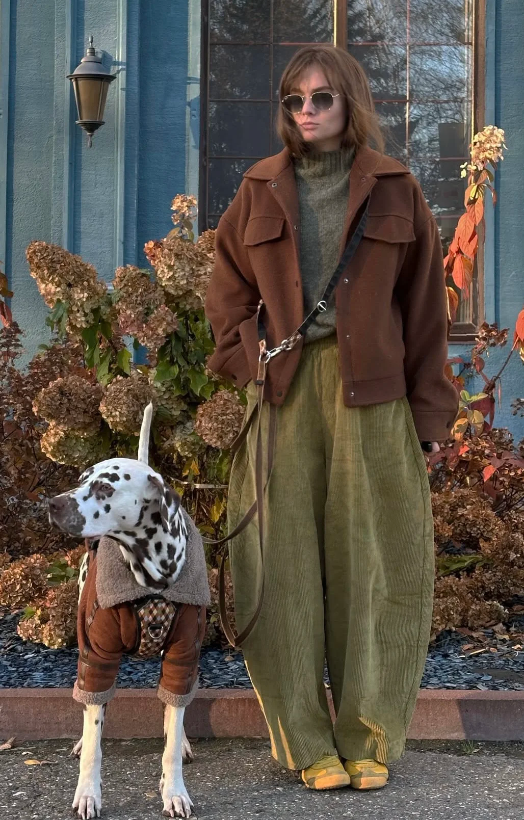 连下装也可以选择选择棕色系的裤子、裙子,全身都是大地色系,看起来就很温暖,很高级。
