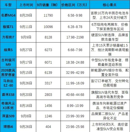 2025年9月份,注定是个不平凡的9月车市,不完全统计有40余场新车上市发布活动,有全新车型,也有迭代车型,或新增车型,进入10月份也该是经验上市新车的市场表现了。