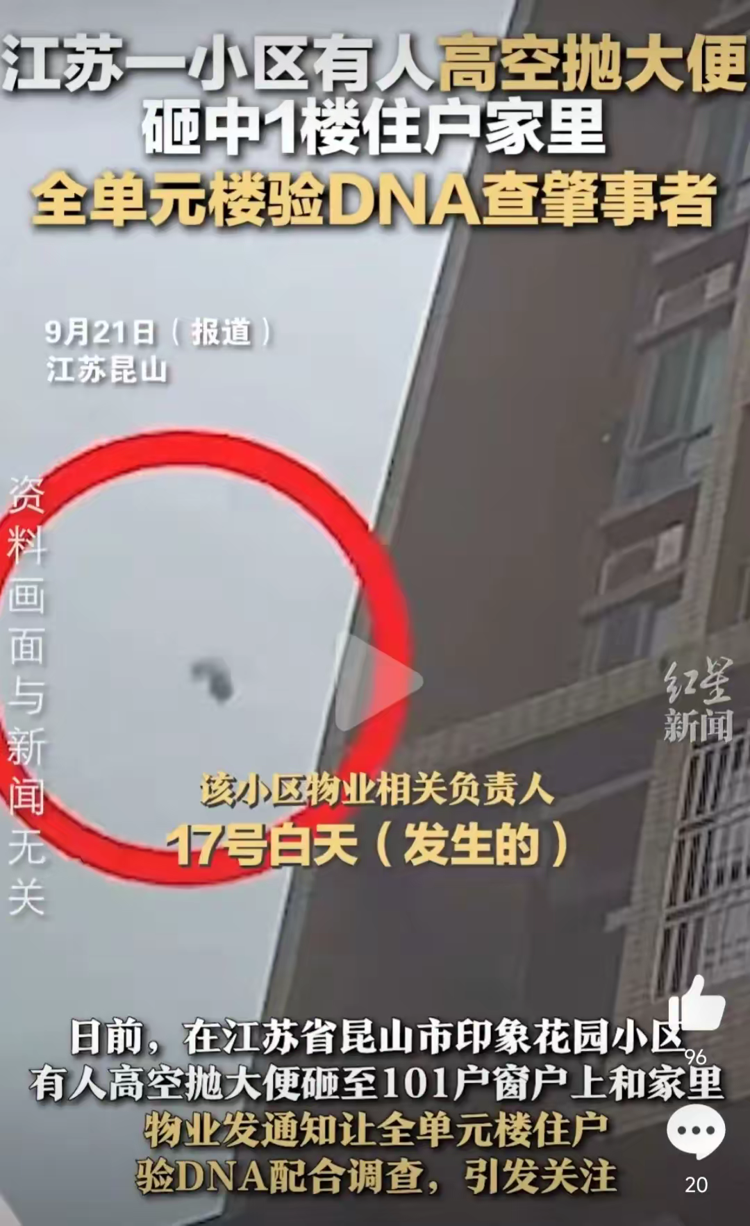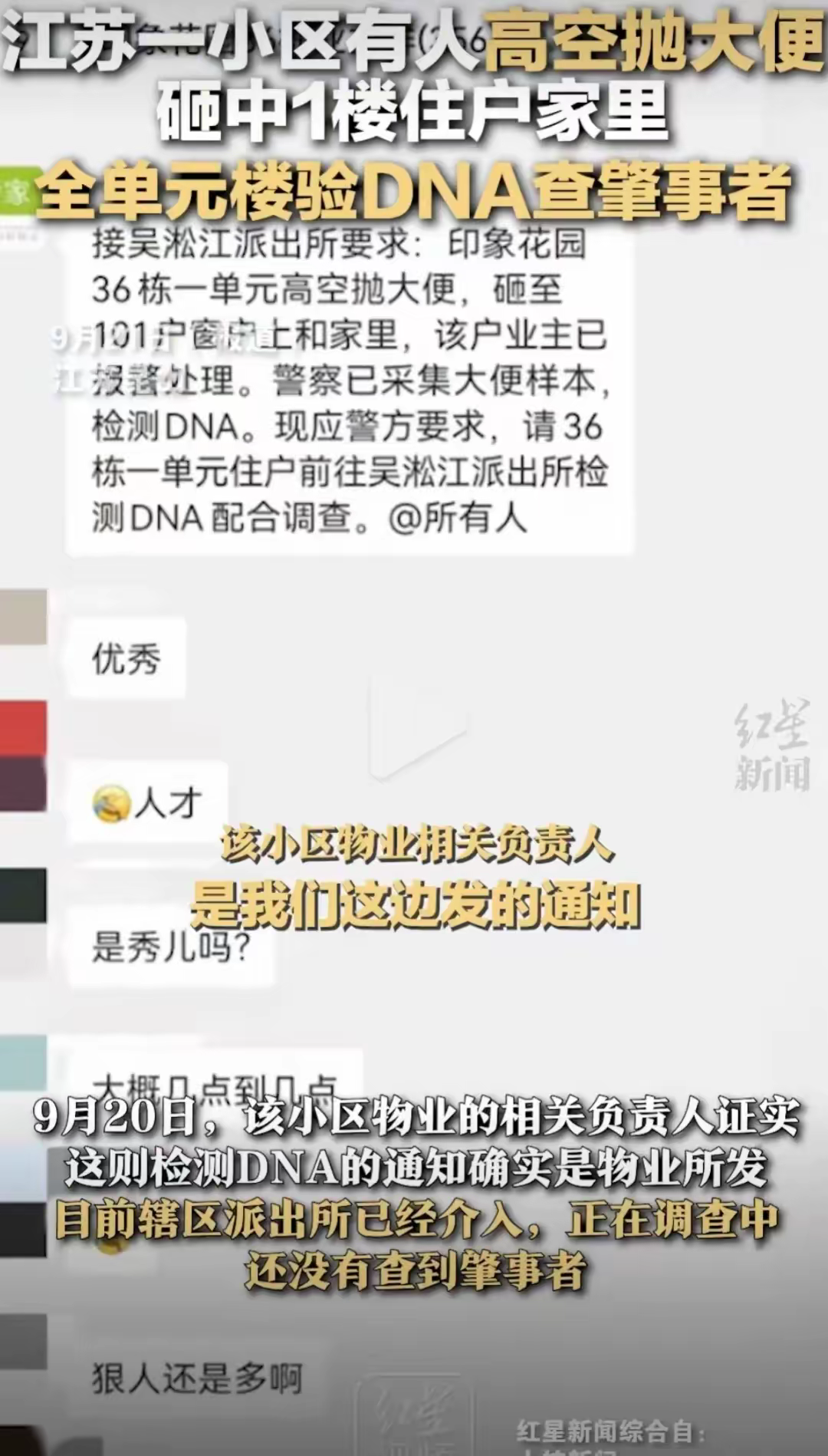 一看竟然是大便,那个气啊,直接立马报警!这高空抛物也太嚣张了吧?为了找出幕后“黑手”,警方直接出大招:全单元进行DNA检测!没错,整栋楼都要来一场“DNA大排查”!