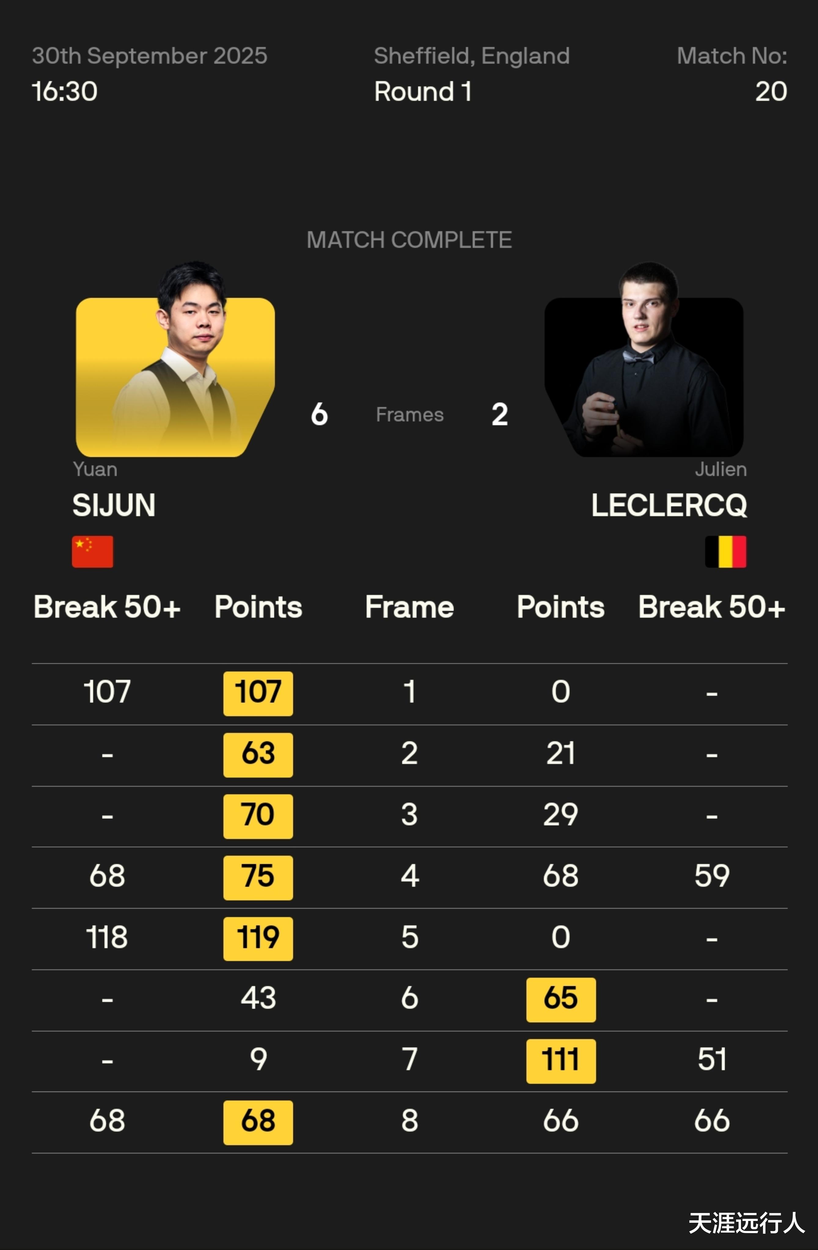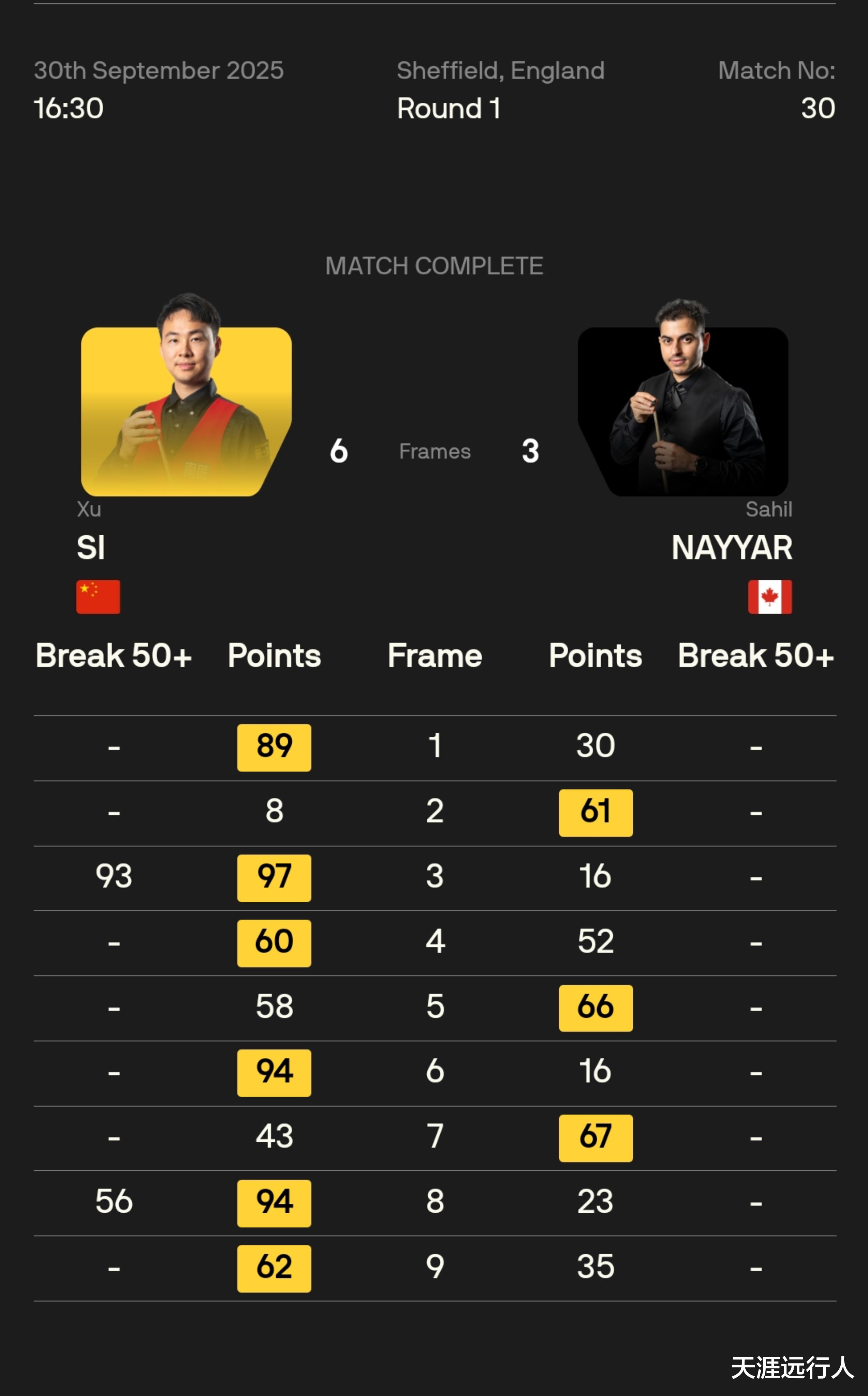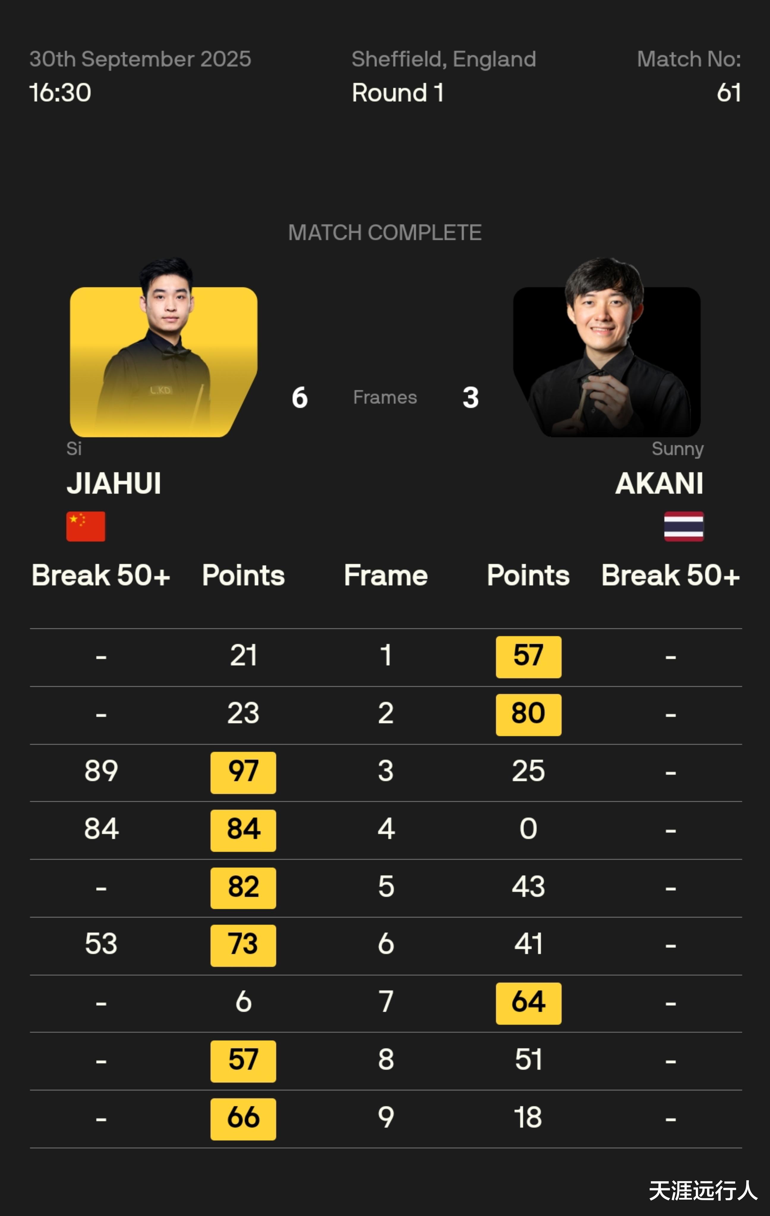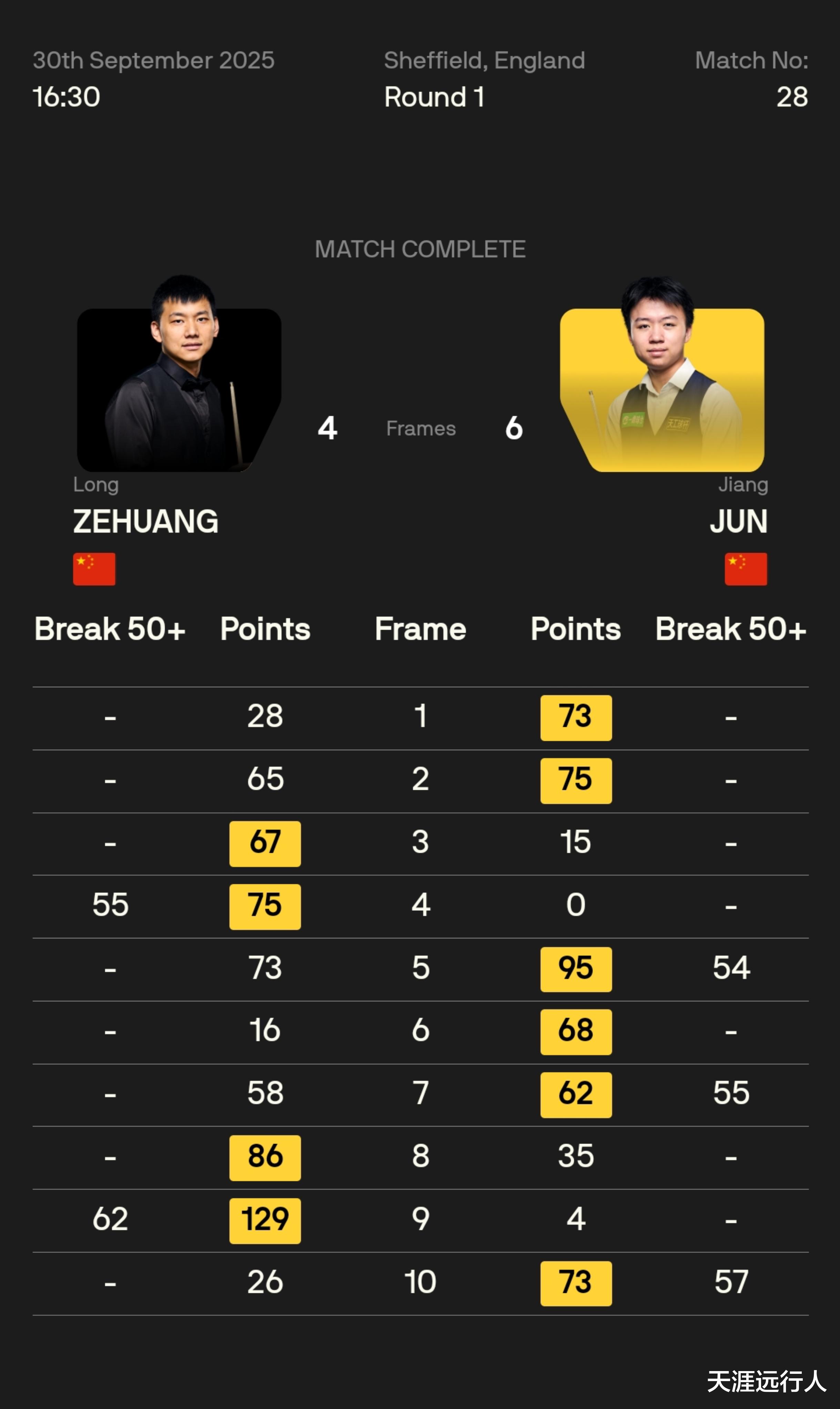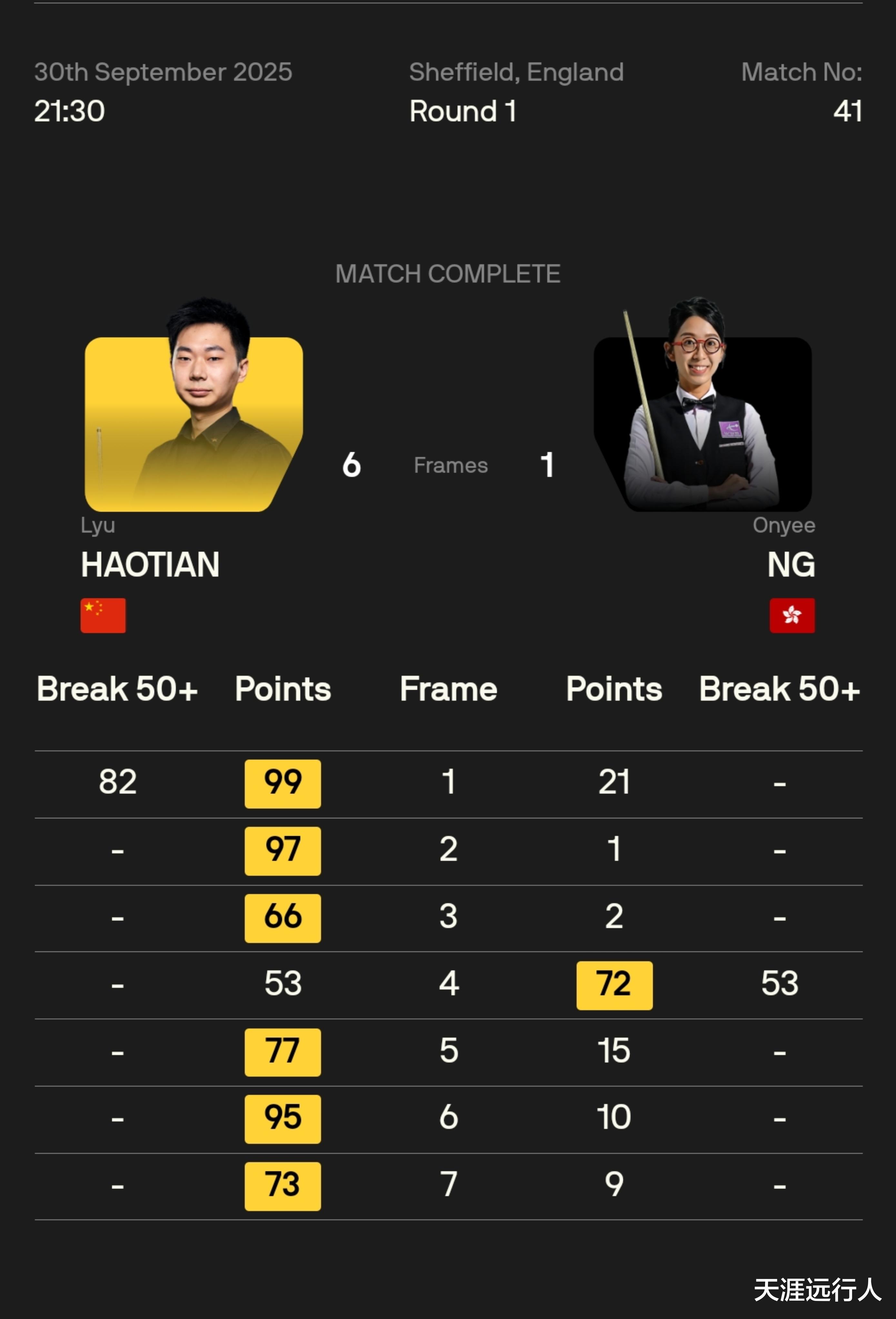北京时间10月1日早7时39分,2025斯诺克国际锦标赛资格赛阶段,首个比赛日的21场角逐,全部决出了胜负。
