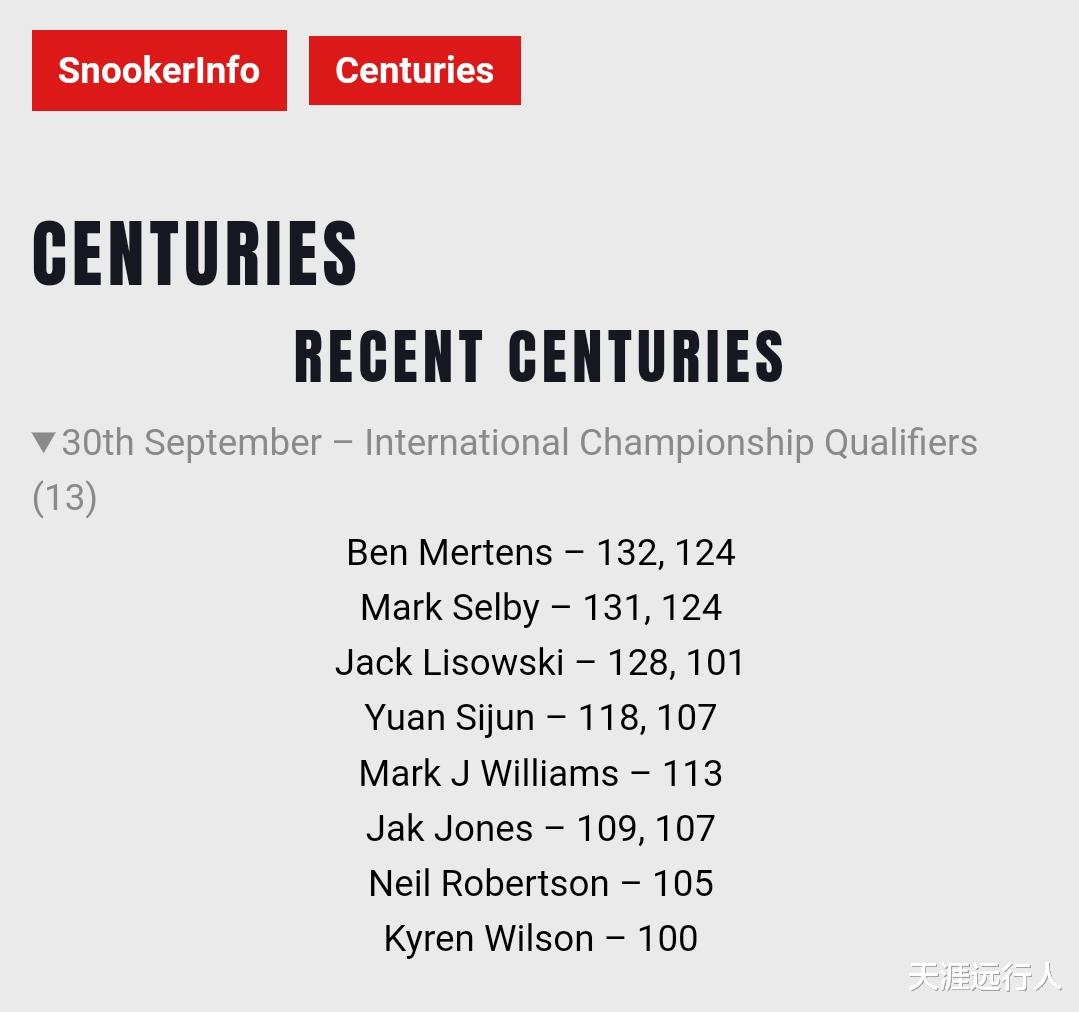 国锦赛资格赛首日共打出13杆单杆过百,比利时小将默滕斯、塞尔比、小司机和袁思俊各打了两杆,默滕斯的单杆132分,暂居单杆最高分。