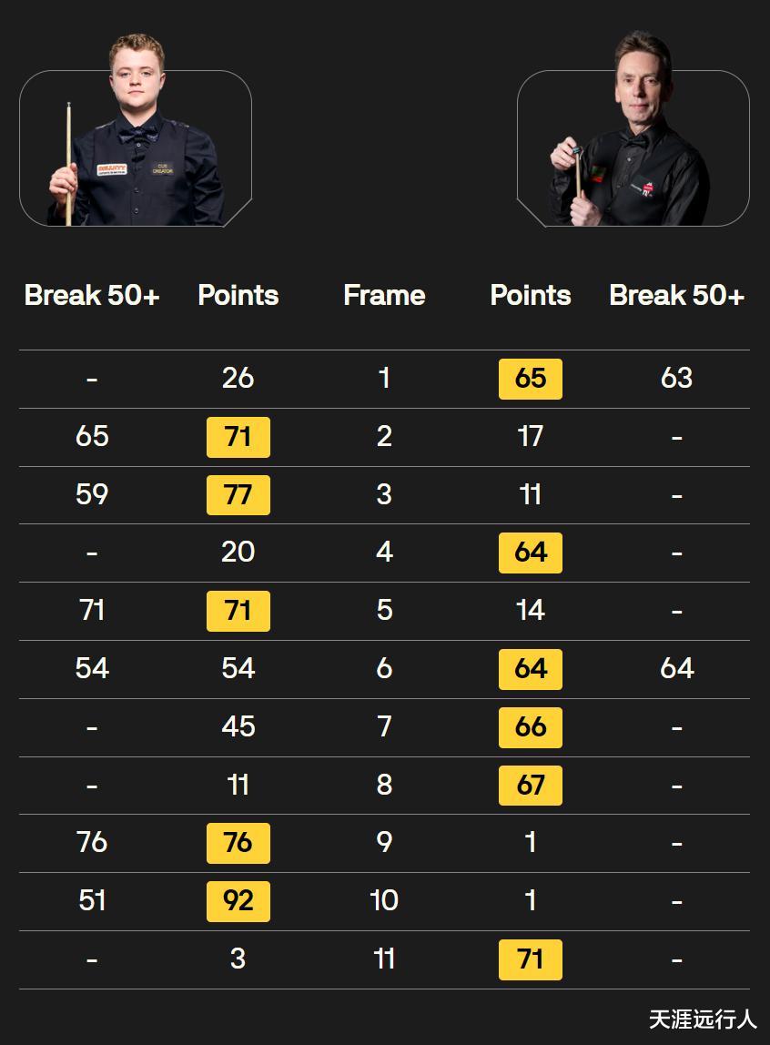 风头一时无两的英格兰天才、19岁的小穆迪,打出六杆50+,竟然以5-6倒在老迈的56岁外卡肯·达赫迪杆下,眼镜惊落一地。