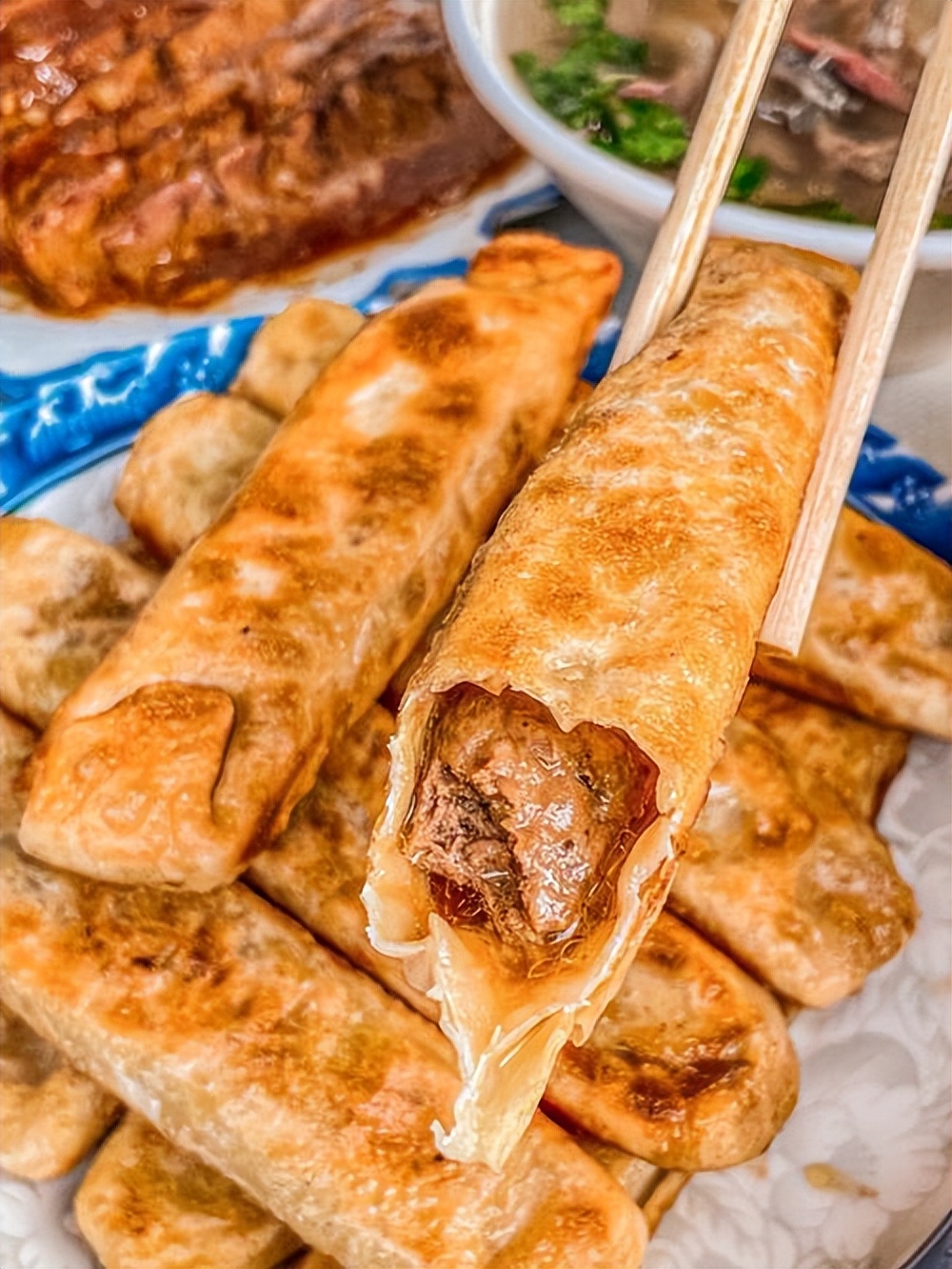 如今这小吃成了省级非遗,皮儿焦脆如纸,咬开是牛羊肉混着元葱的鲜香,配上羊杂汤,老沈阳人能可劲儿造一整宿。