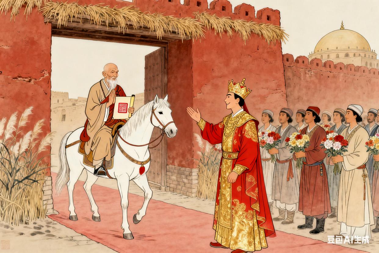 走到高昌国时,玄奘已经瘦得脱了形,僧袍上满是沙尘。高昌王麹文泰早就听说过这位西行的僧人,亲自到城门迎接。夜里,麹文泰请他住在王宫,摆了丰盛的宴席,可玄奘只吃了几口素食。麹文泰问他:“师西行求法,路途如此艰险,若在高昌弘法,寡人愿举国供养,何必再去天竺?”玄奘放下筷子,双手合十:“大王厚意,贫僧心领。但贫僧立誓西行,若中途停下,便是失信于初心。”麹文泰看着他坚定的眼神,沉默了许久,最后说:“既如此,寡人与师结为兄弟,为师准备粮草、马匹,再写二十四通国书,让沿途各国相助。”第二天,高昌国的百姓夹道送行,玄奘骑着麹文泰送的白马,手里拿着盖着高昌国印的国书,回头望了一眼高昌城,心里满是感激——这一路,终于有了第一个真正懂他的人。