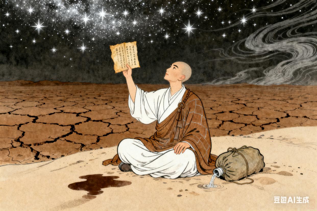 出了凉州,就是莫贺延碛。玄奘跟着一支商队走了两天,后来商队怕遇沙暴,提前折返,他只能独自前行。走了第四天,水袋不小心打翻了——他看着水在沙地上瞬间渗没,只留下一小片深色的印记,心一下子沉了下去。接下来的日子,他靠嚼沙枣充饥,渴得实在不行,就含一口沙子润润喉咙。夜里躺在沙地上,看着满天的星星,耳边只有风的呼啸,他甚至能听到自己的心跳声,又重又慢。有好几次,他觉得自己撑不下去了,就摸出怀里的《心经》,轻声念着:“心无挂碍,无挂碍故,无有恐怖,远离颠倒梦想。”念着念着,又有了站起来的力气。直到第七天,他看到远处的水草,踉跄着跑过去,趴在水边,大口喝着水,水的清凉顺着喉咙滑下去,他才敢相信,自己真的走出了沙漠。