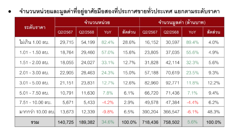 尽管待售公寓数量增加了11.2%,但由于进入市场的低价公寓供应增加,其价值下降了15.6%。这导致平均售价从2024年第二季度的600万泰铢下降到本季度的430万泰铢。虽然总体而言,本季度二手住宅物业所有权转让量同比下降了 -8.6%(套数)和 -11.1%(价值),但与今年第一季度相比,分别提高了 18.2% 和 16.8%。低于100万泰铢的价格组仍然占据转让份额的最高水平,为35.1%,表明购买力仍然处于基层水平。