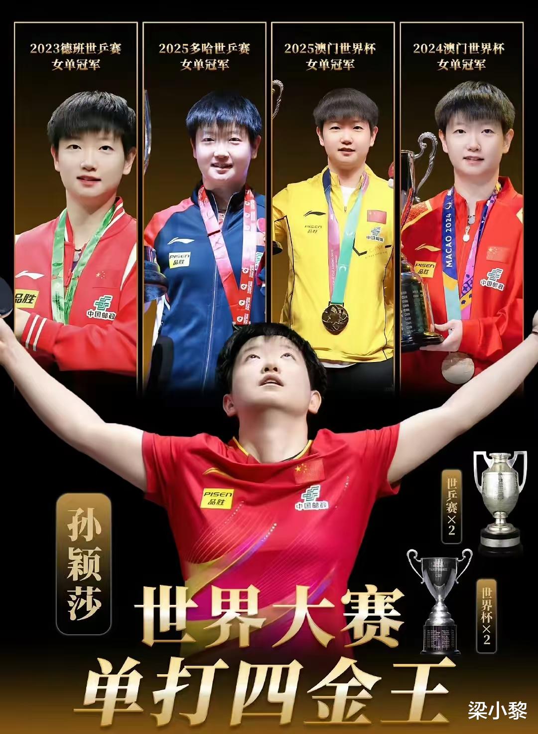 孙颖莎卫冕世锦赛女单冠军、世界杯女单冠军,但她没有全运会冠军和奥运会女单冠军。