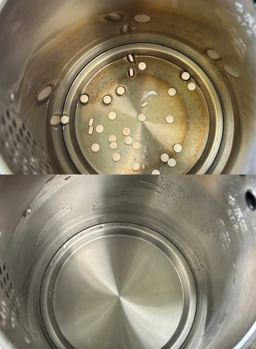 这个时候用蛮力刷也刷不掉,用钢丝球还会划伤水壶。可如果家里有vc或者是泡腾片,哪怕是过期了都没关系。