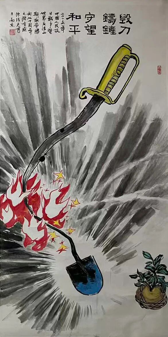 而《毁刀铸铲 守望和平》,则是从痛感里生长出的希望。军刀的刀刃被熔铸为铁铲,火焰与星芒裹着刀身,将凶器化为耕耘的工具 —— 刀是战争的符号,铲是生机的象征,这一转化,是对 “以战止战” 的另一种诠释:真正的救赎,是将暴力的遗产,锻造成滋养和平的土壤。画中题字 “中国人民抗日战争胜利之日,世界反法西斯战争胜利之日”,把个体创作锚定在民族与世界的共同记忆里,角落里的幼芽,恰是和平最温柔的注脚。