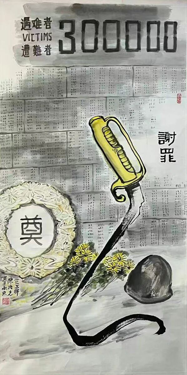 陈先生说:我面对南京大屠杀三十万遇难者名单墙时,我认为日本军国主义应该下跪谢罪,但他们至今没有认罪,一心想复活军国主义,我没有画人,而是用一把军刀代表日本军国主义,我相信有一天他们要下跪,那时才能得到受害者的宽恕,才能与邻近国家和平相处。