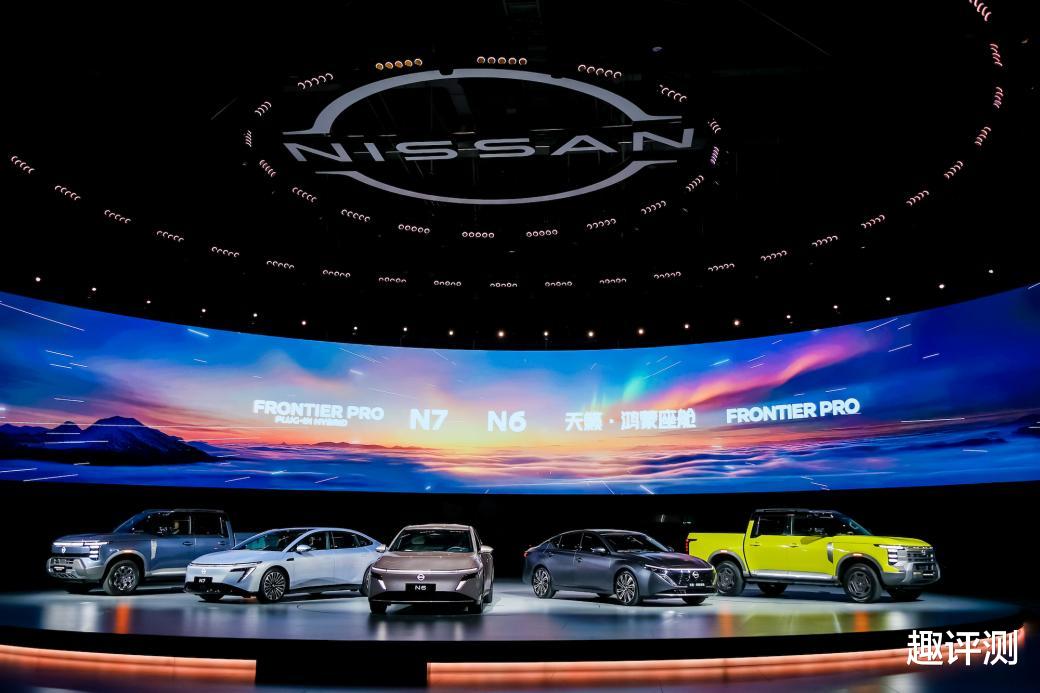 车型亮相,从左至右:Frontier Pro PHEV、N7、N6、天籁·鸿蒙座舱、Frontier Pro