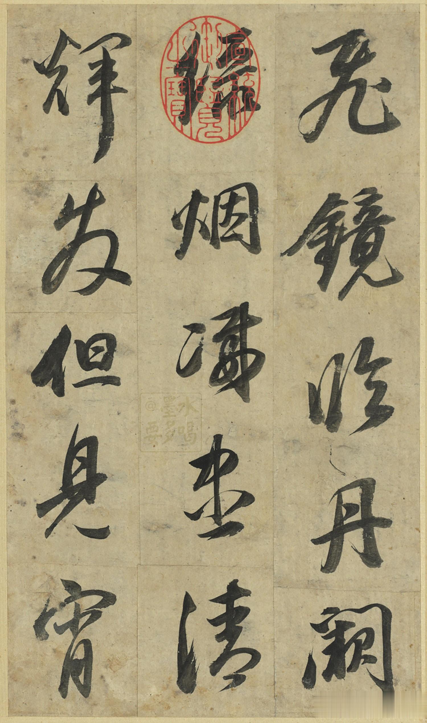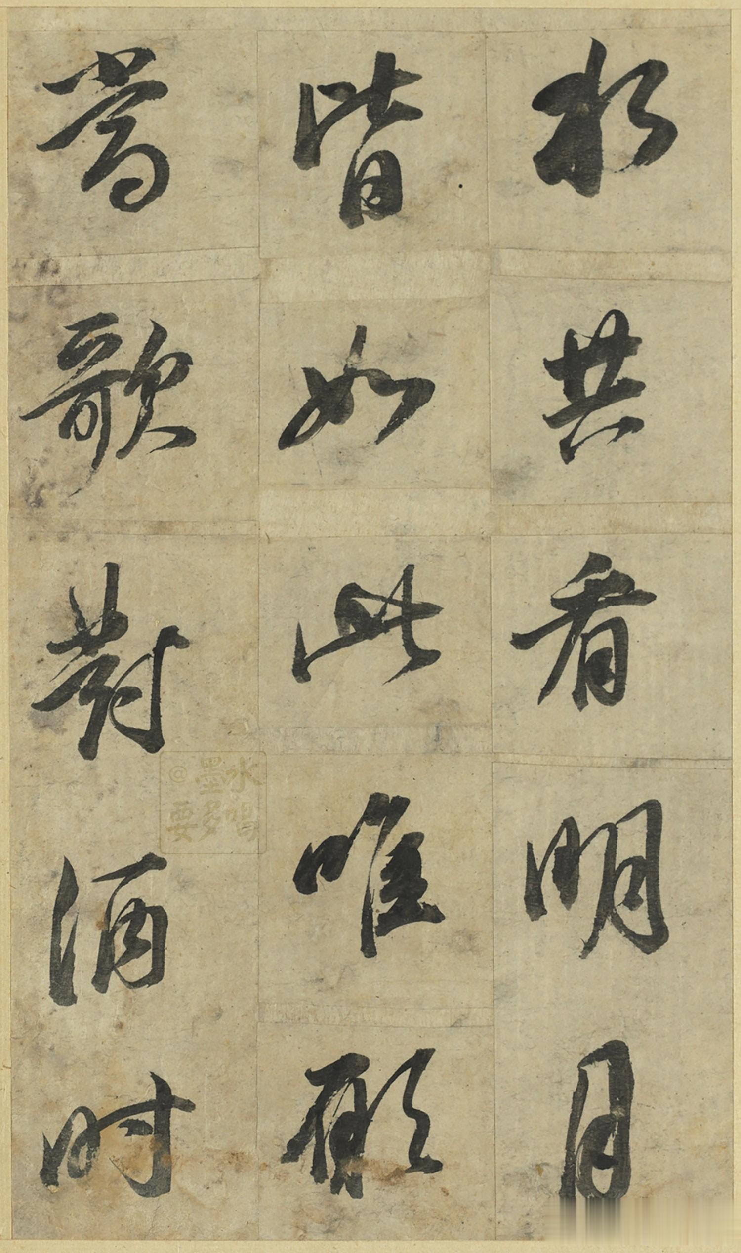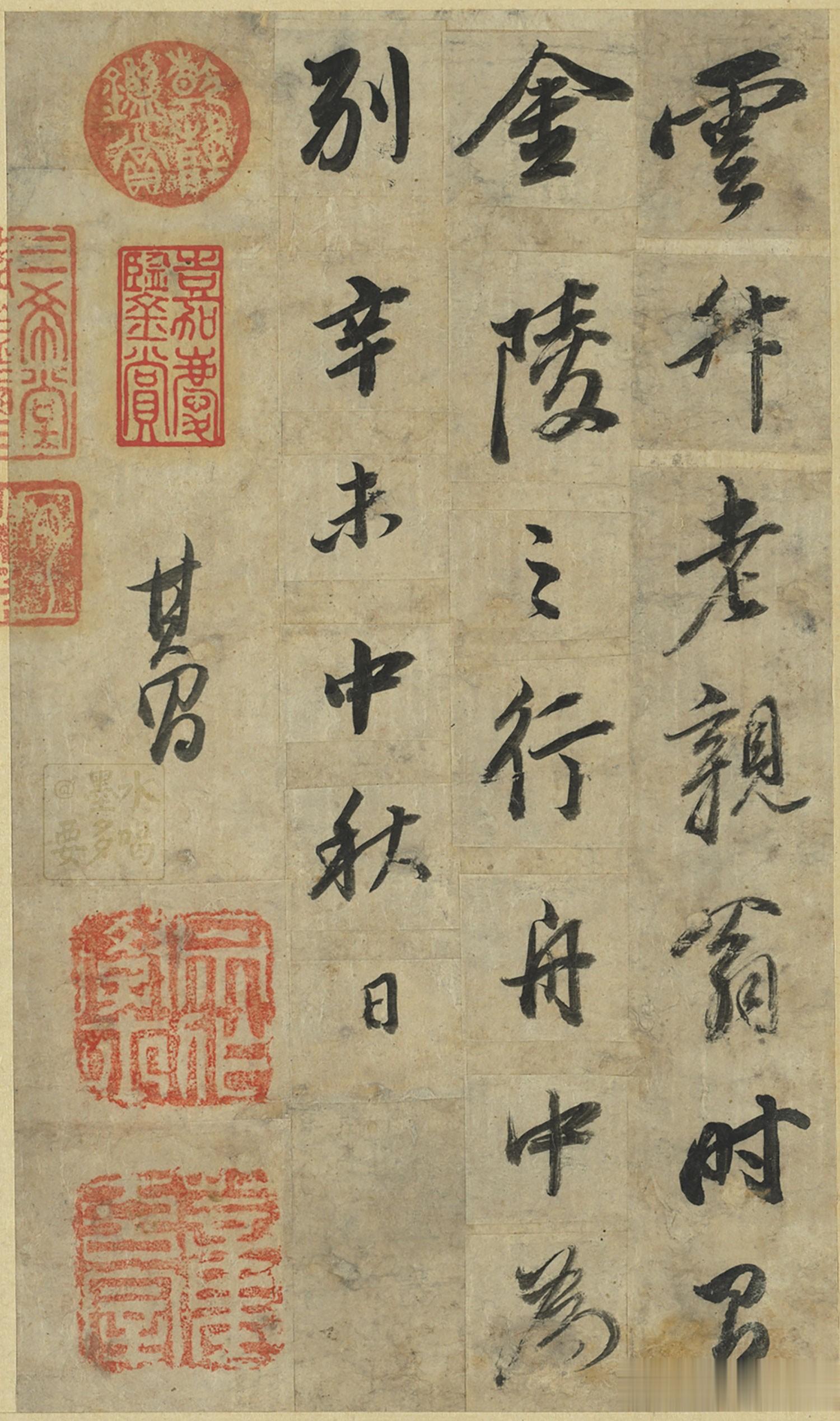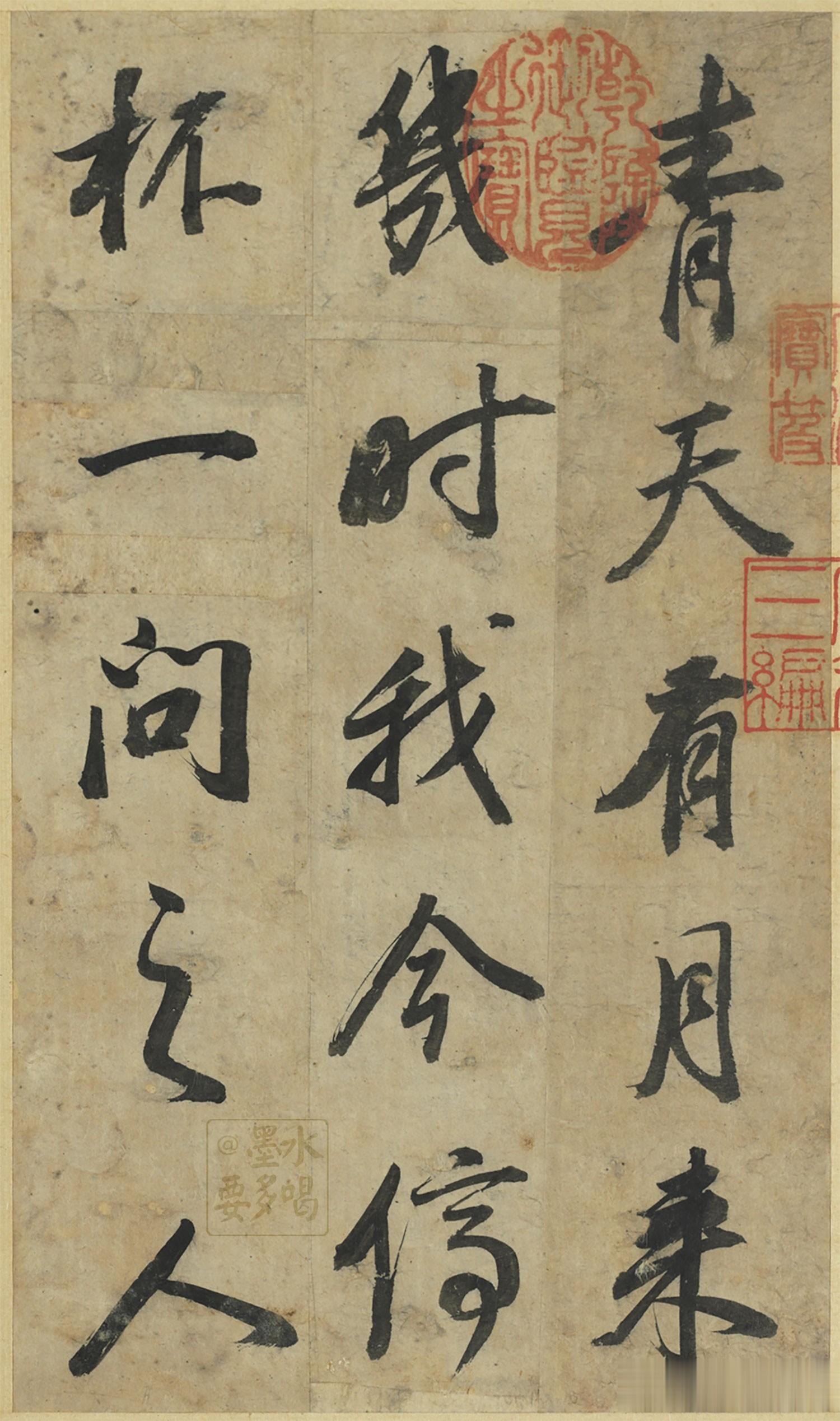 这幅字是董其昌为“老亲翁(应该和他有姻亲关系的亲家翁)”所书,写的两首诗句也比较适合用来赠送友人:一首诗李白的《把酒问月·故人贾淳令予问之》,还有一首是李白的《同族侄评事黯游昌禅师山池二首》中的前面部分。