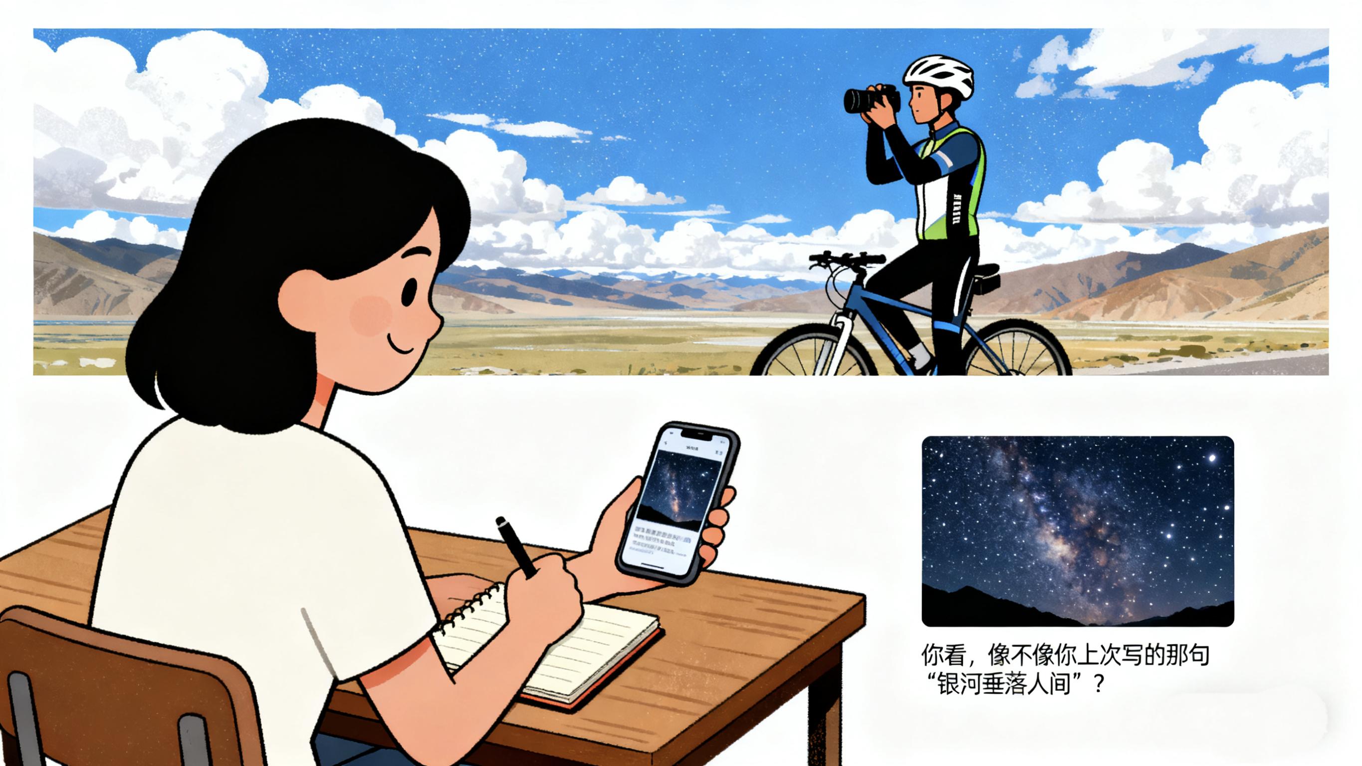 他拍到一张绝美的星空,会发给我:“你看,像不像你上次写的那句‘银河垂落人间’?”