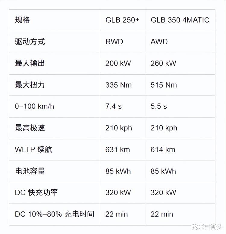 电动版本的2026款GLB采用最新800V架构,并搭载85kWh电池,在效率与续航表现上大幅提升。官方公布的WLTP测试结果显示,后驱的GLB 250+拥有631km的续航,而更高动力的GLB 350 4MATIC依然具备614km的续航表现,显示两款车型在电动车市场中都有极强竞争力。