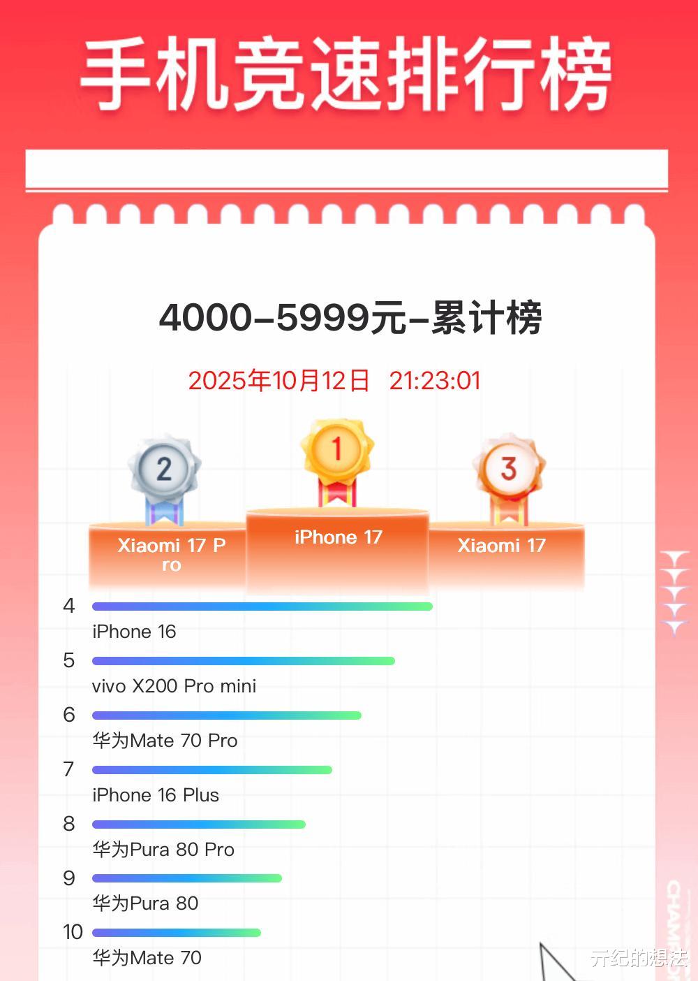 排名第四的是小米17 Pro Max,16GB+512GB版售价6299元,16GB+1TB版售价6999元,是榜单中最畅销的安卓手机和国产手机。从某东自营平台来看,该机目前依旧处于缺货状态,部分版本需要推迟到10月25日后才有现货,其火爆程度可见一斑。看了一下4000-5999元的竞速榜,小米17Pro和小米17仅次于iPhone17,分别排在榜单第二名和第三名。