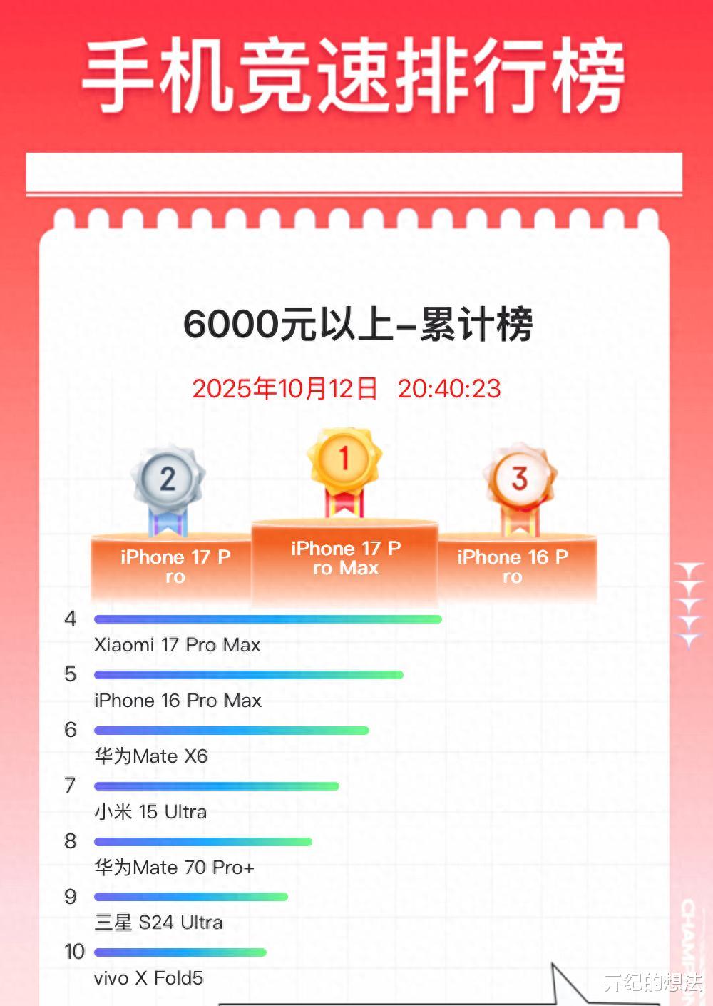 对于京东高端智能手机竞速榜,亓纪的想法是这样的:非常好奇到底是谁还在买iPhone16Pro Max,5999元的iPhone16Pro还可以,毕竟很多网友已经接受了128GB扩容的解决方案,虽然目前的亓纪依旧不推荐这种方案。小米17Pro Max成绩还不错,两款华为旗舰真的很强势,三星S24Ultra和vivo X Fold5都挺意外和惊喜的。