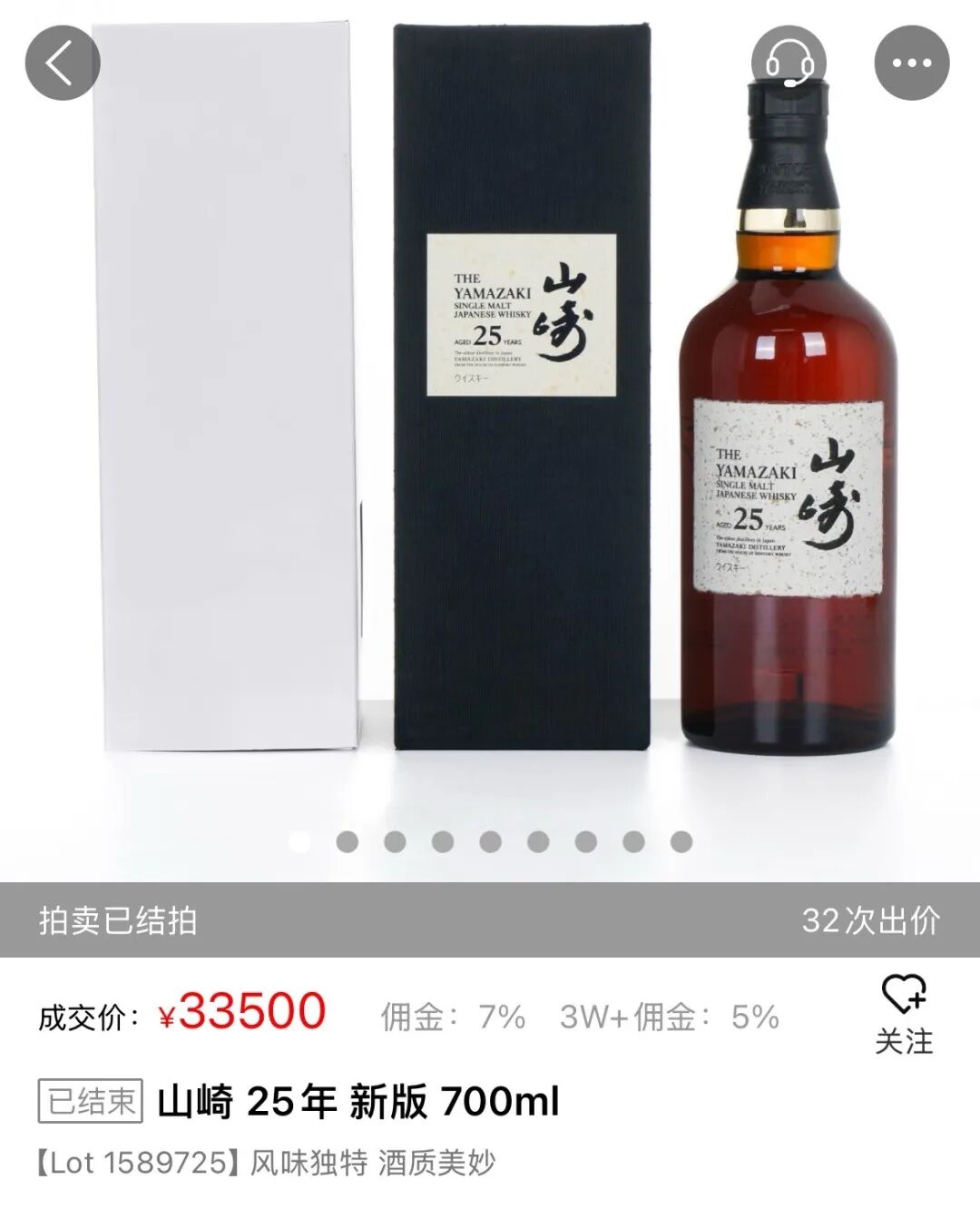 其次本款山崎25年新版是本年拍卖场的“常驻嘉宾”,已成交接近20次,价格区间维持在¥42200-¥30200。本期以¥33500的价格落入买家口袋,市场行情趋于稳定,也是对其价值的一种肯定。