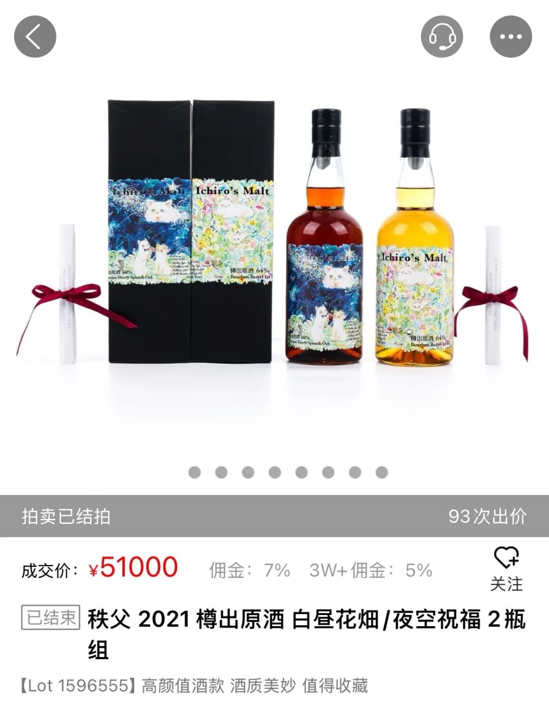 日威三大巨头闪耀拍场,首先是一组由秩父酒厂2021年推出的樽出原酒,限量100套。酒标设计精美,表面镶嵌施华洛世奇水晶,是秩父的高颜值酒款。八月份的拍卖中,曾出价至6万,但流拍,未能成交。此次成交价为¥51000,较之前参考价小幅下滑,反映出投资者信心不足和市场观望情绪。