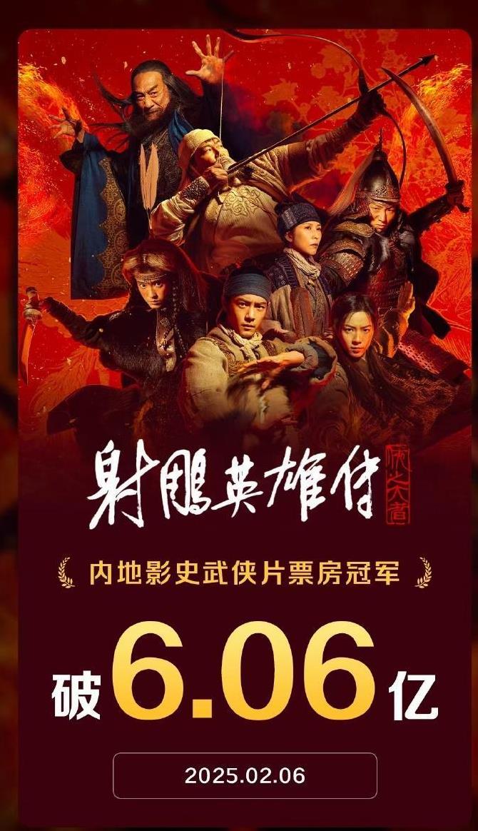电影界仿佛被点亮了一盏璀璨的明灯,《射雕英雄传:侠之大者》犹如一颗耀眼的星辰,在武侠片的天空中掀起了惊涛骇浪。截至2月6日,它的票房如火箭般飙升,成功突破6.0631亿,一举超越了曾经的冠军《狄仁杰之四大天王》,震撼登顶内地影史武侠片票房新冠军,这无疑是一次震撼人心的胜利。