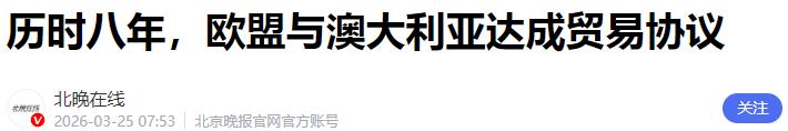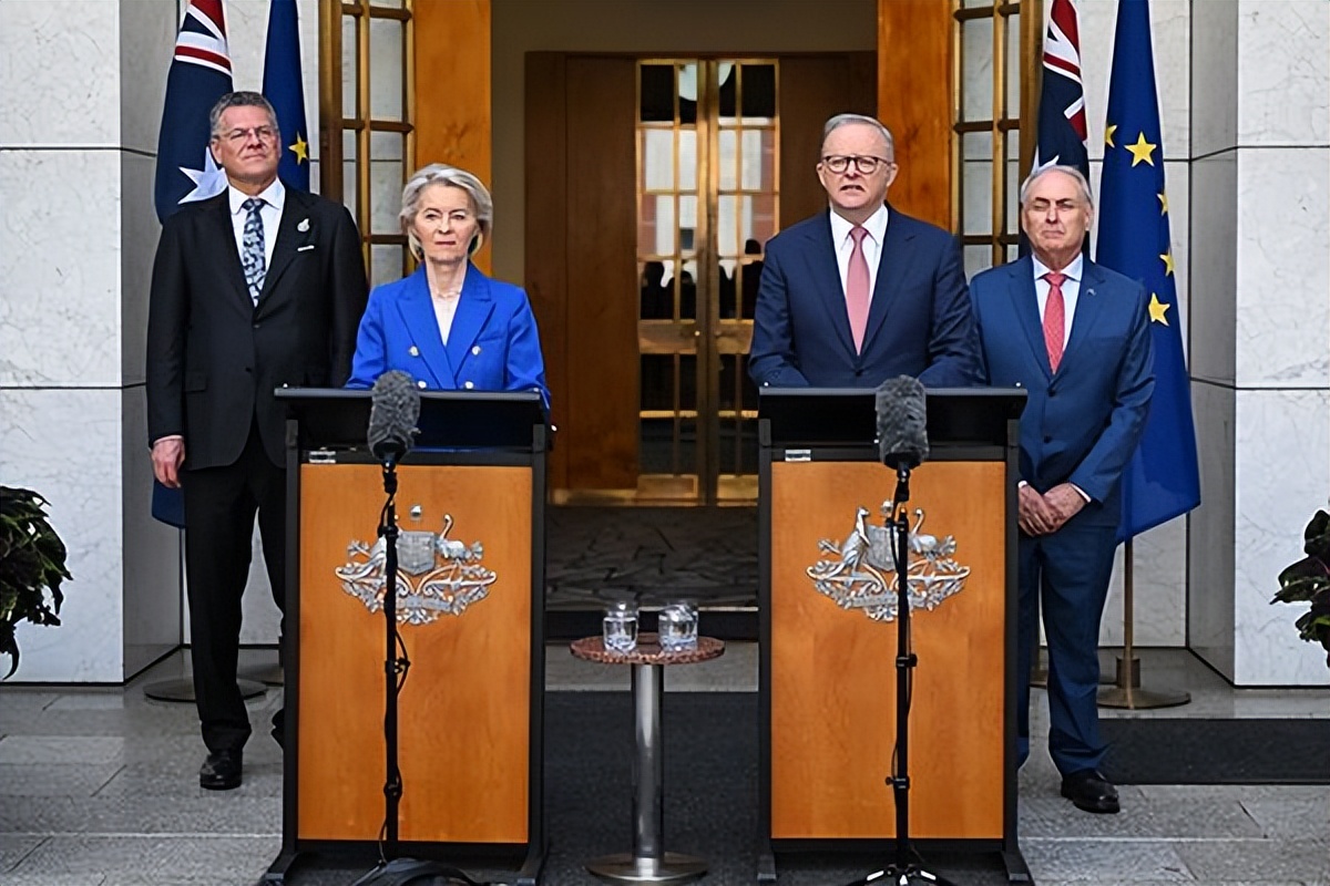 当地时间3月24日,欧盟委员会主席乌尔苏拉·冯德莱恩在澳大利亚堪培拉与澳大利亚总理安东尼·阿尔巴尼斯共同宣布达成自由贸易协定。这场谈判始于2018年春季,历经15轮磋商,曾在2023年一度陷入僵局,最终在2026年初画上句号。