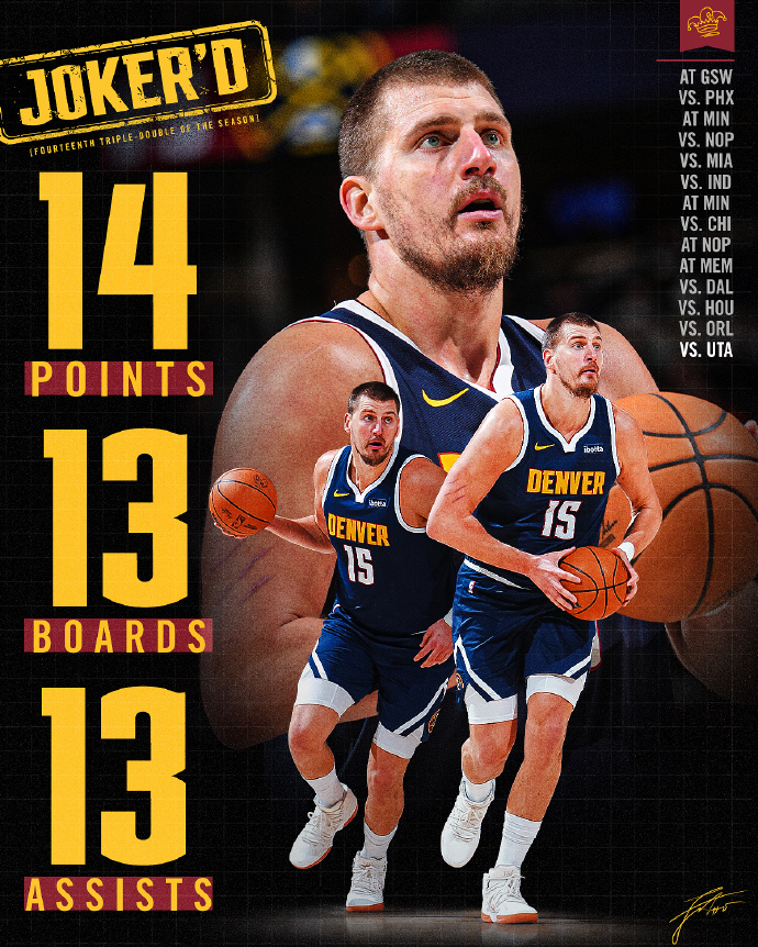掘金全队一共7人得分上双,其中4人得分20+,还不包括约基奇。约基奇今天得分虽然不高,但依旧表现出色,轻松拿下三双,仅出场29分钟,投篮7中5,三分球1中1,罚球4中3,拿到14分13篮板13助攻2抢断3盖帽的数据,正负值+22。